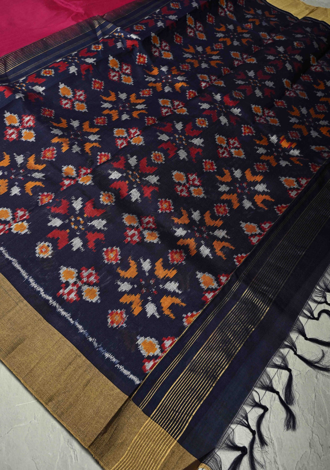 The saree is adorned with intricate floral embroidery, adding texture and sophistication to the vibrant rani pink fabric. The Ikkat pallu introduces a touch of artisanal elegance, showcasing geometric patterns and heritage-inspired craftsmanship.