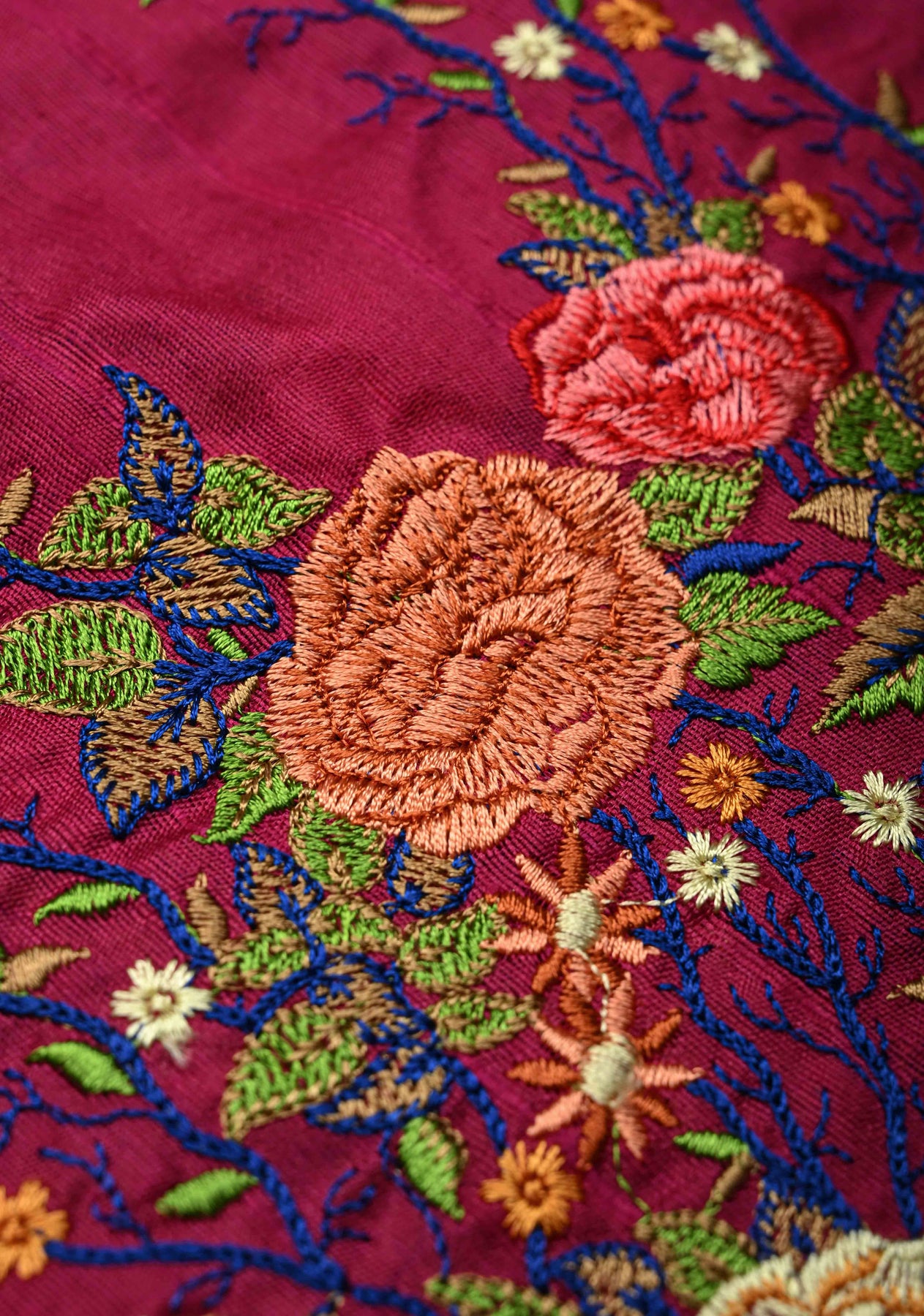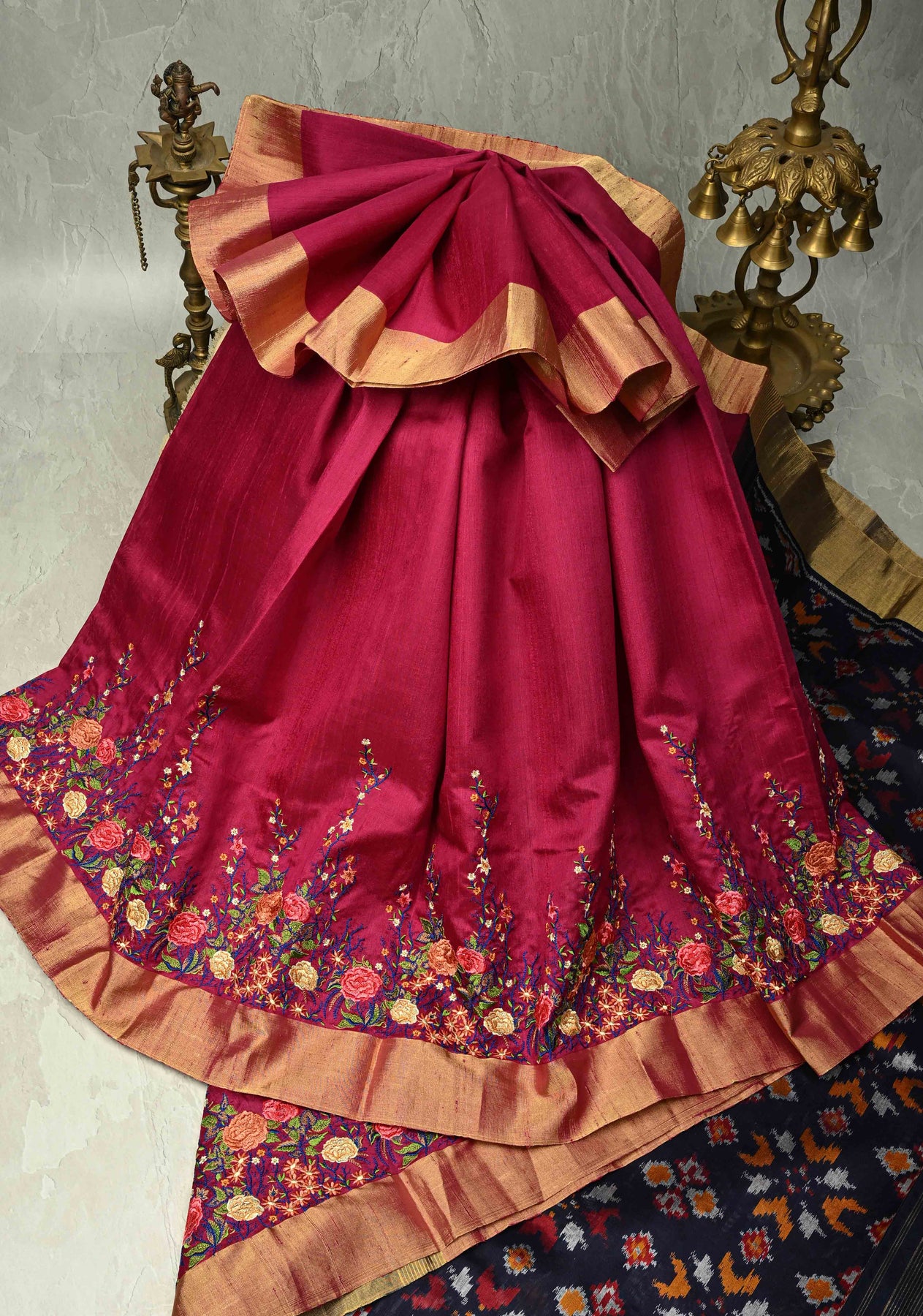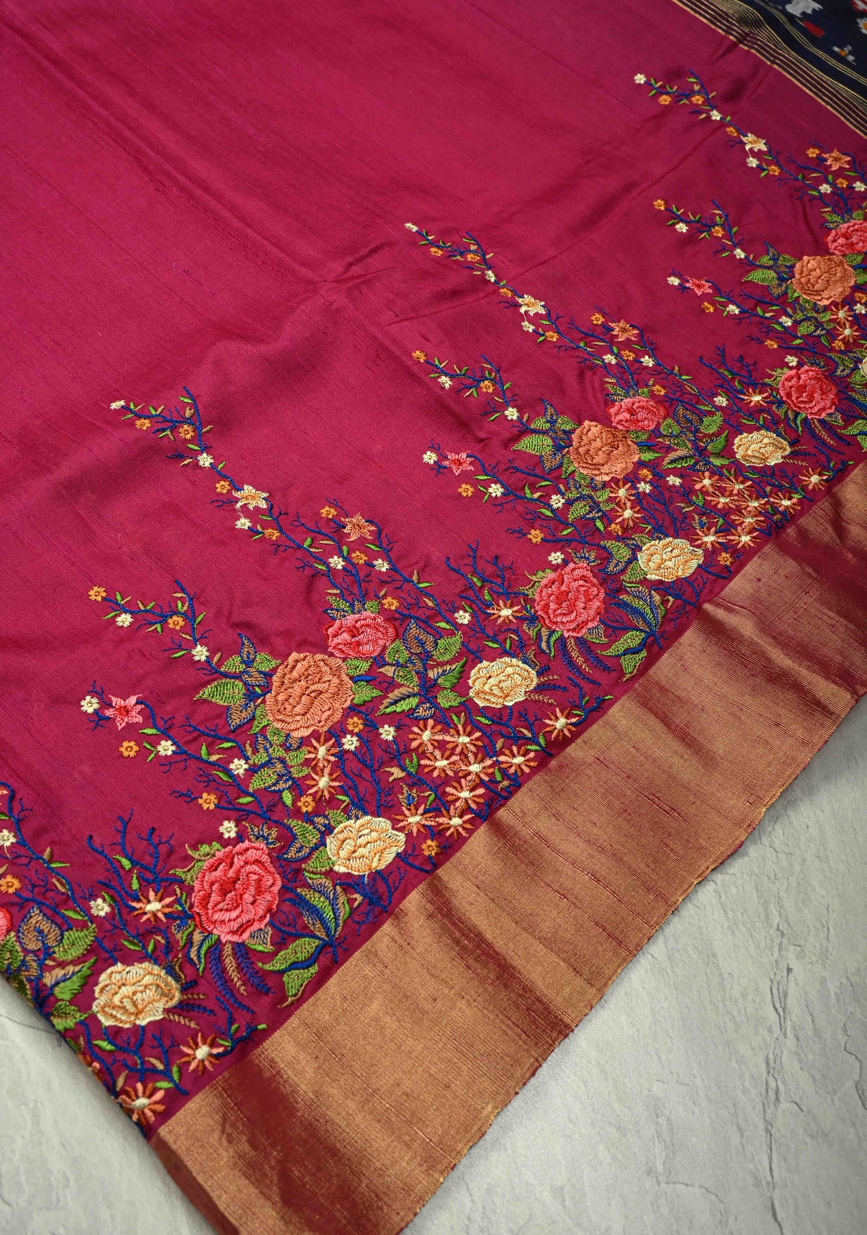 Rani Pink Pure Raw Silk Saree with Floral Embroidery and Ikkat Pallu and Blouse Piece | SILK MARK CERTIFIED
