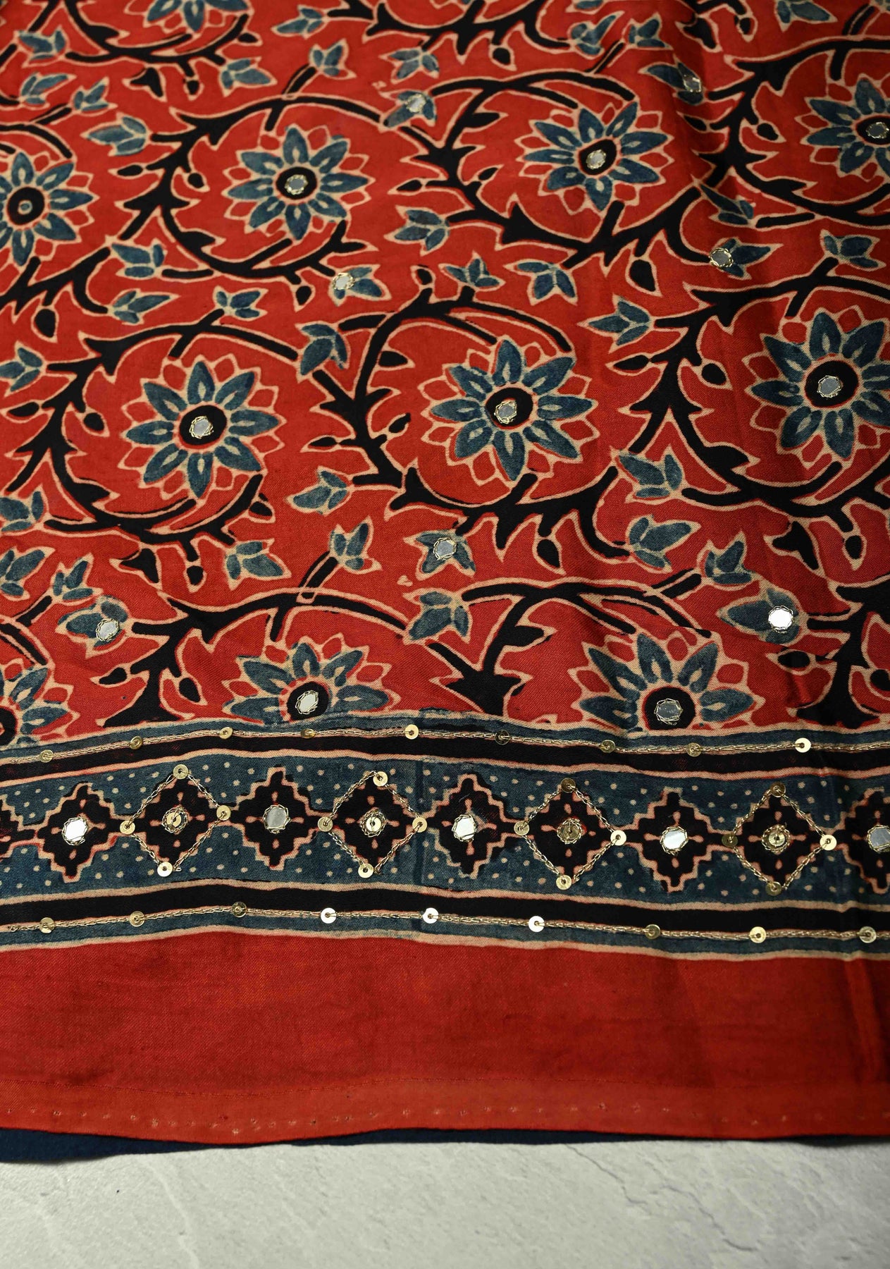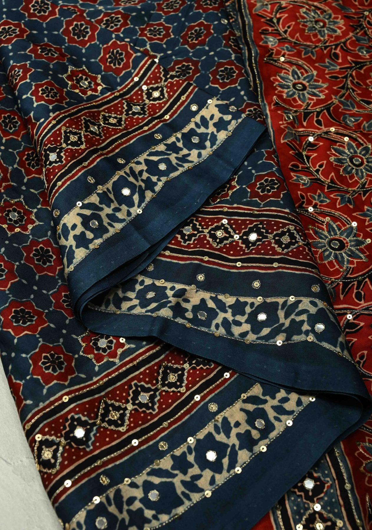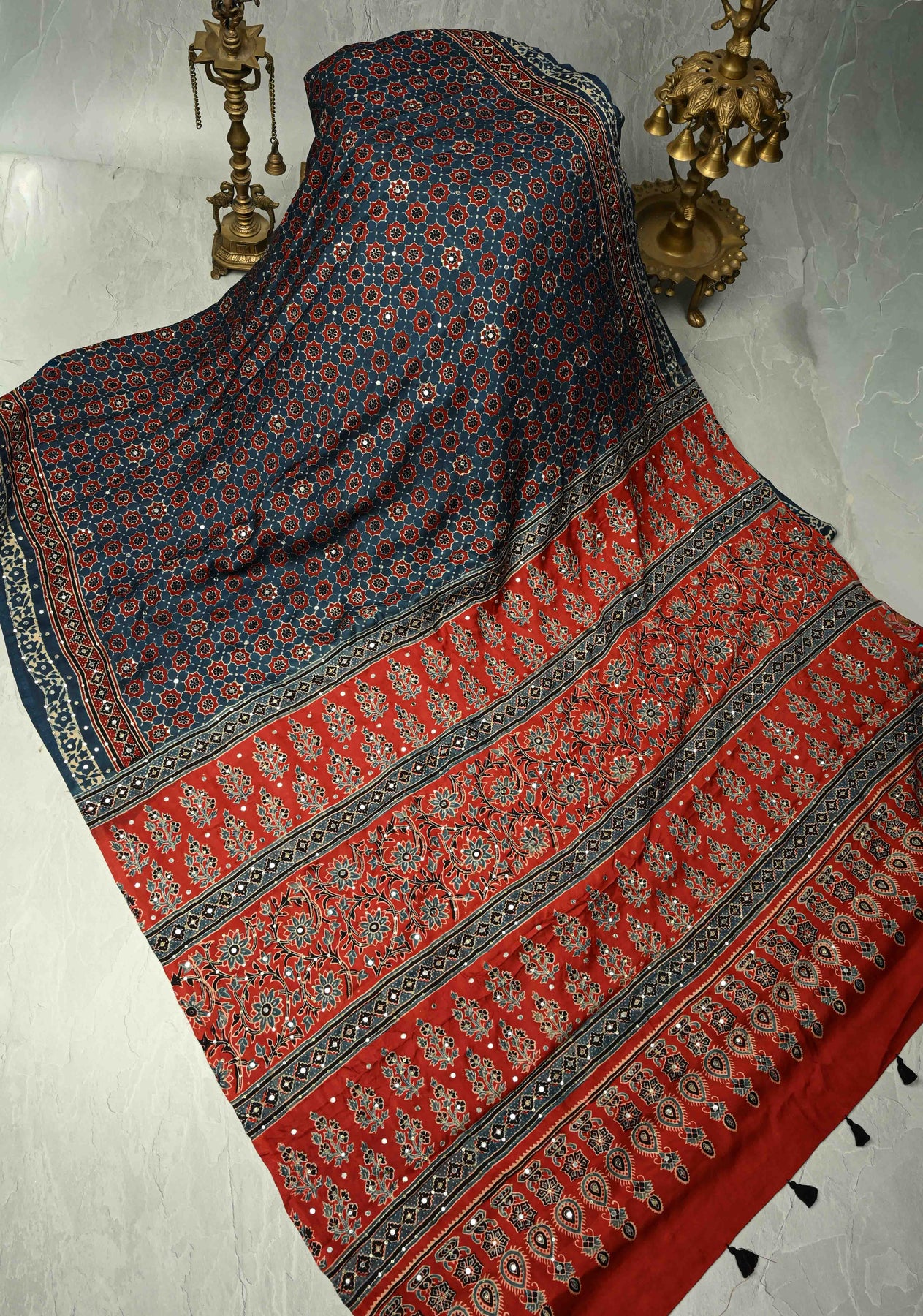 Celebrate the artistry of Indian craftsmanship with this Indigo Ajrakh Block Print Modal Saree with Mirror and Ari Work, a stunning blend of tradition, texture, and elegance. Handcrafted using the ancient Ajrakh block printing technique, this saree features intricate geometric and floral motifs in rich indigo tones, printed with natural dyes on soft, flowing modal fabric.
