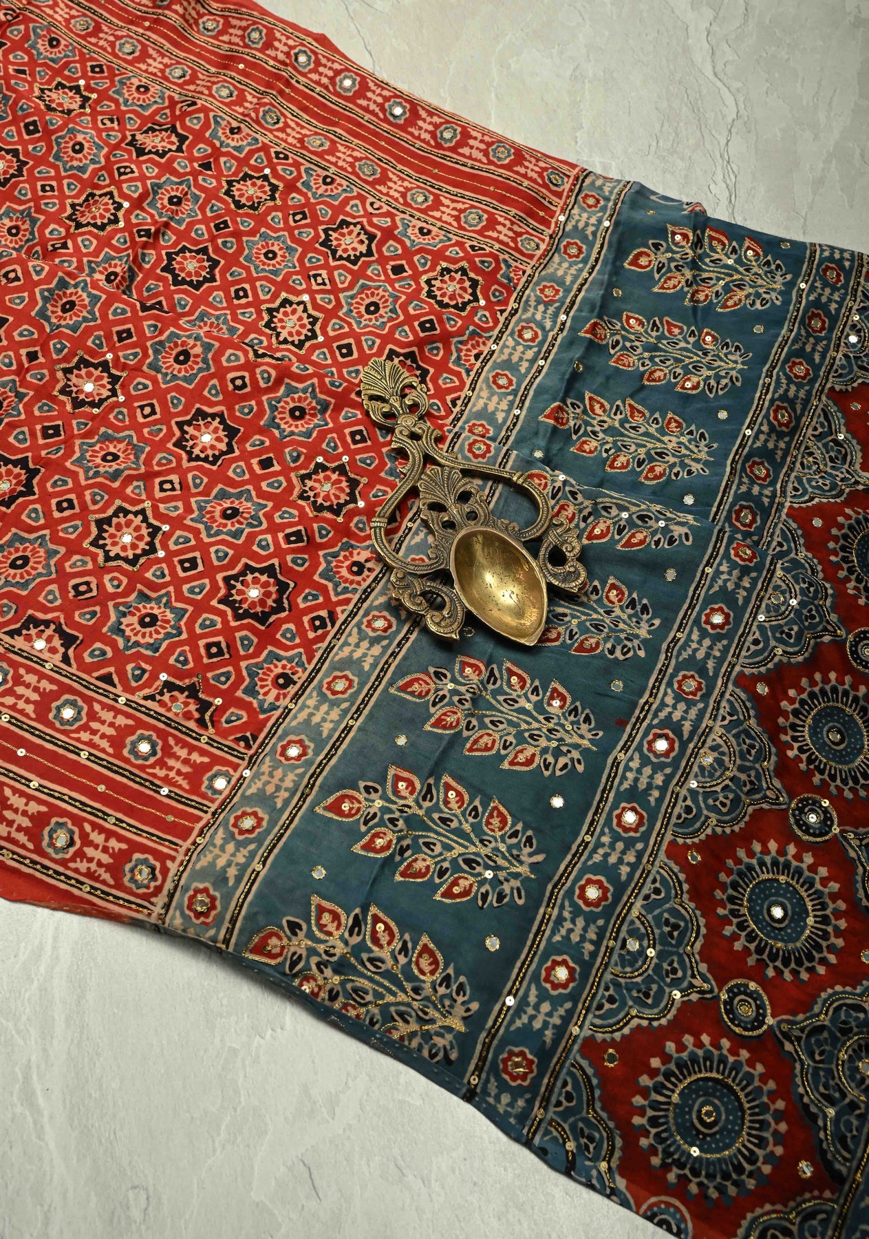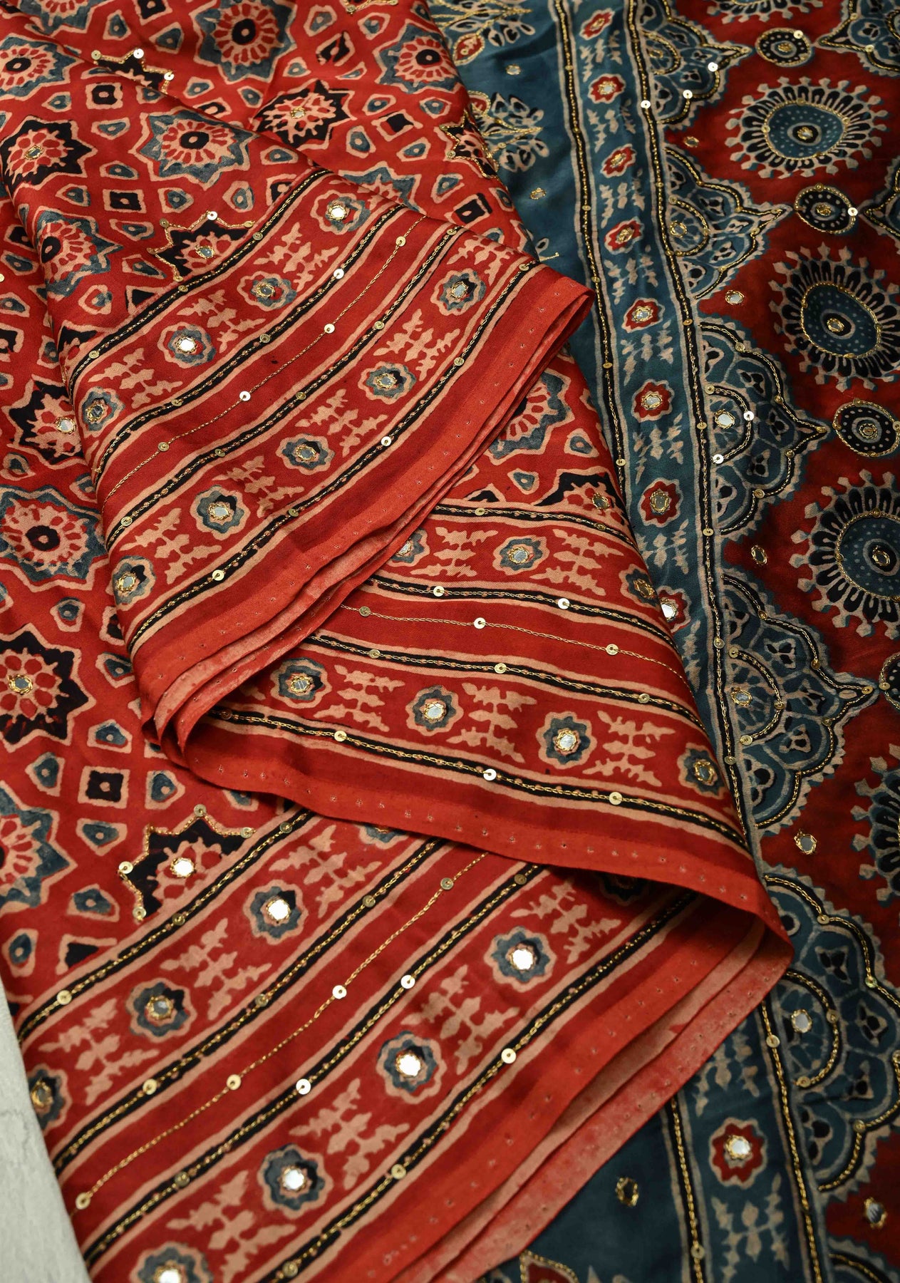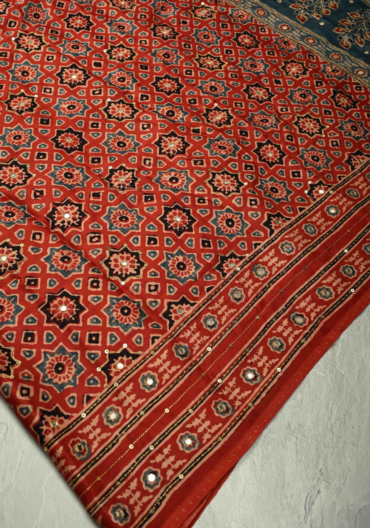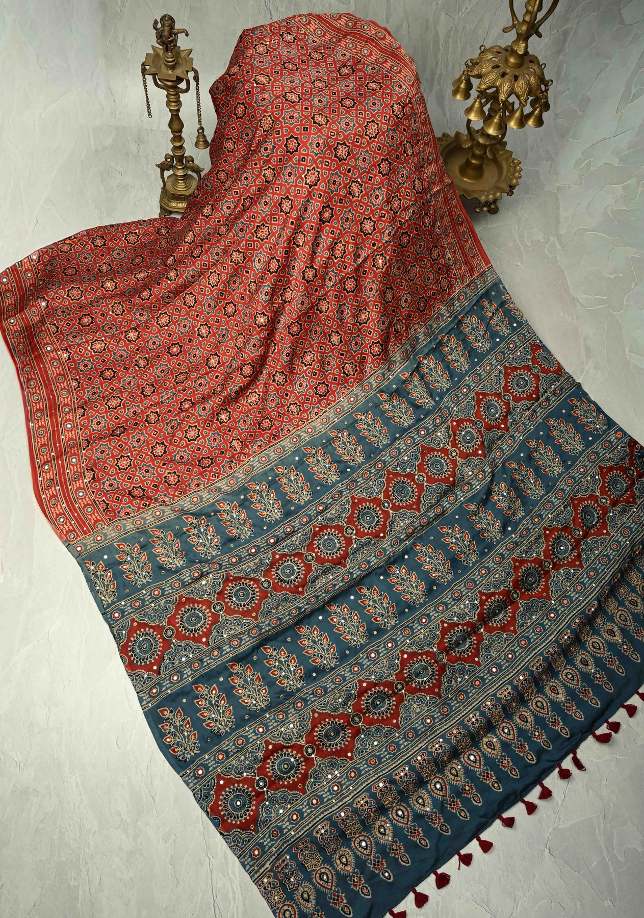 Red Ajrakh Hand Block Print on Modal Silk Saree with Aari-Mirror Work and Blue Pallu