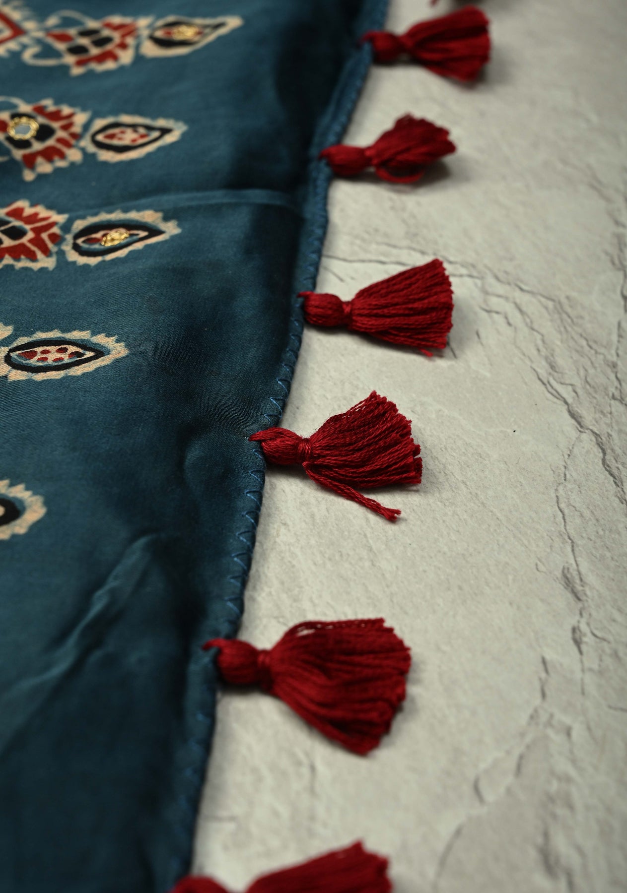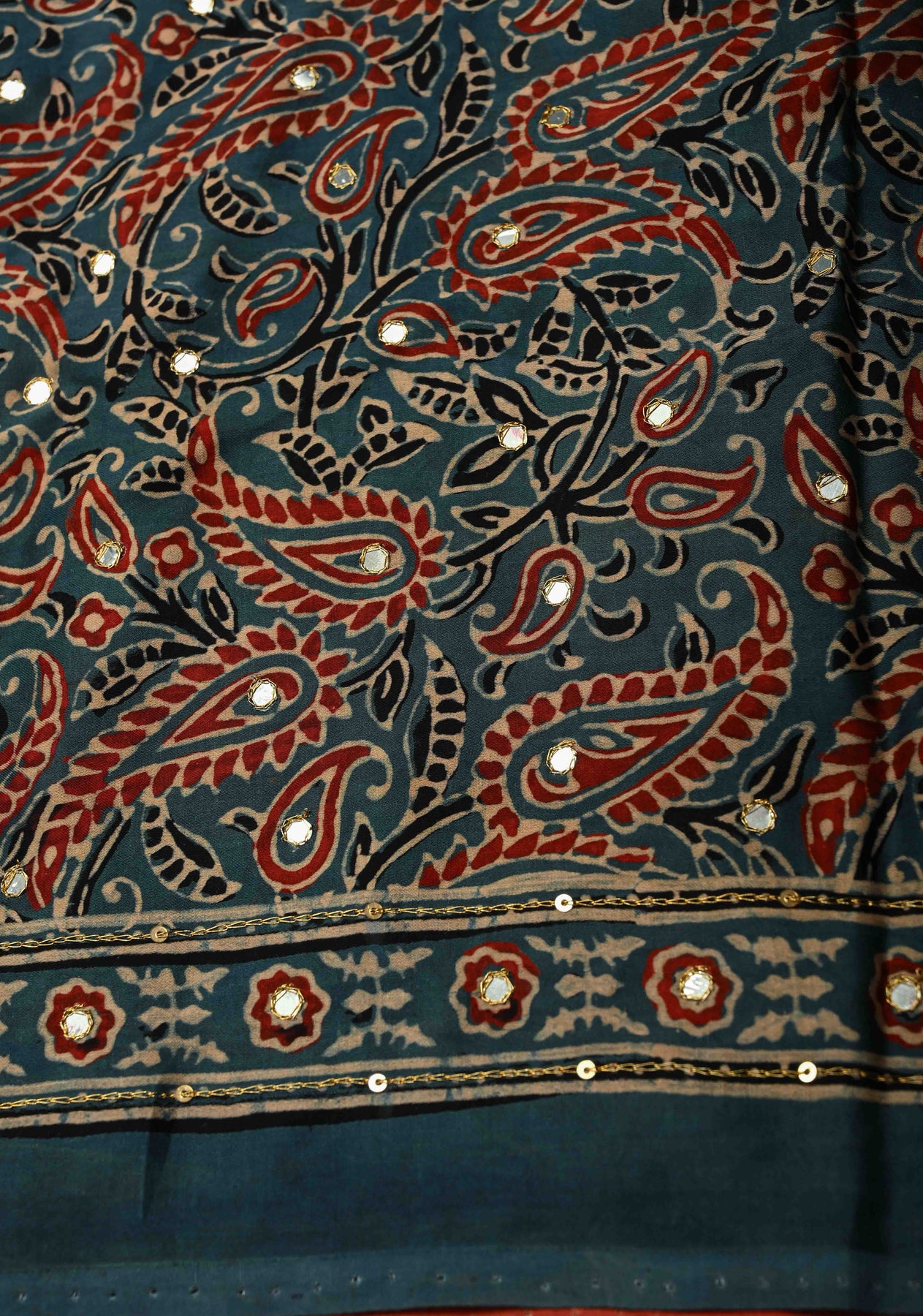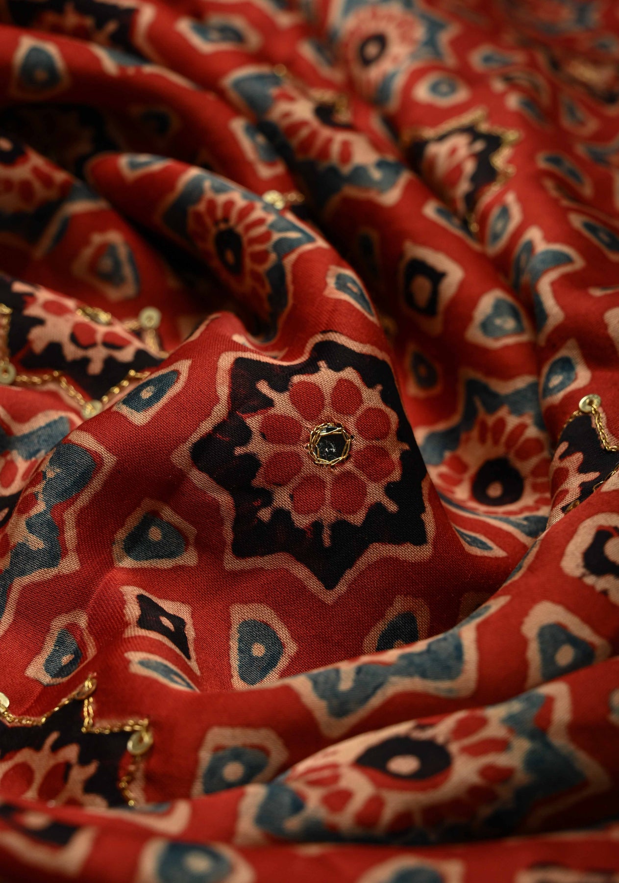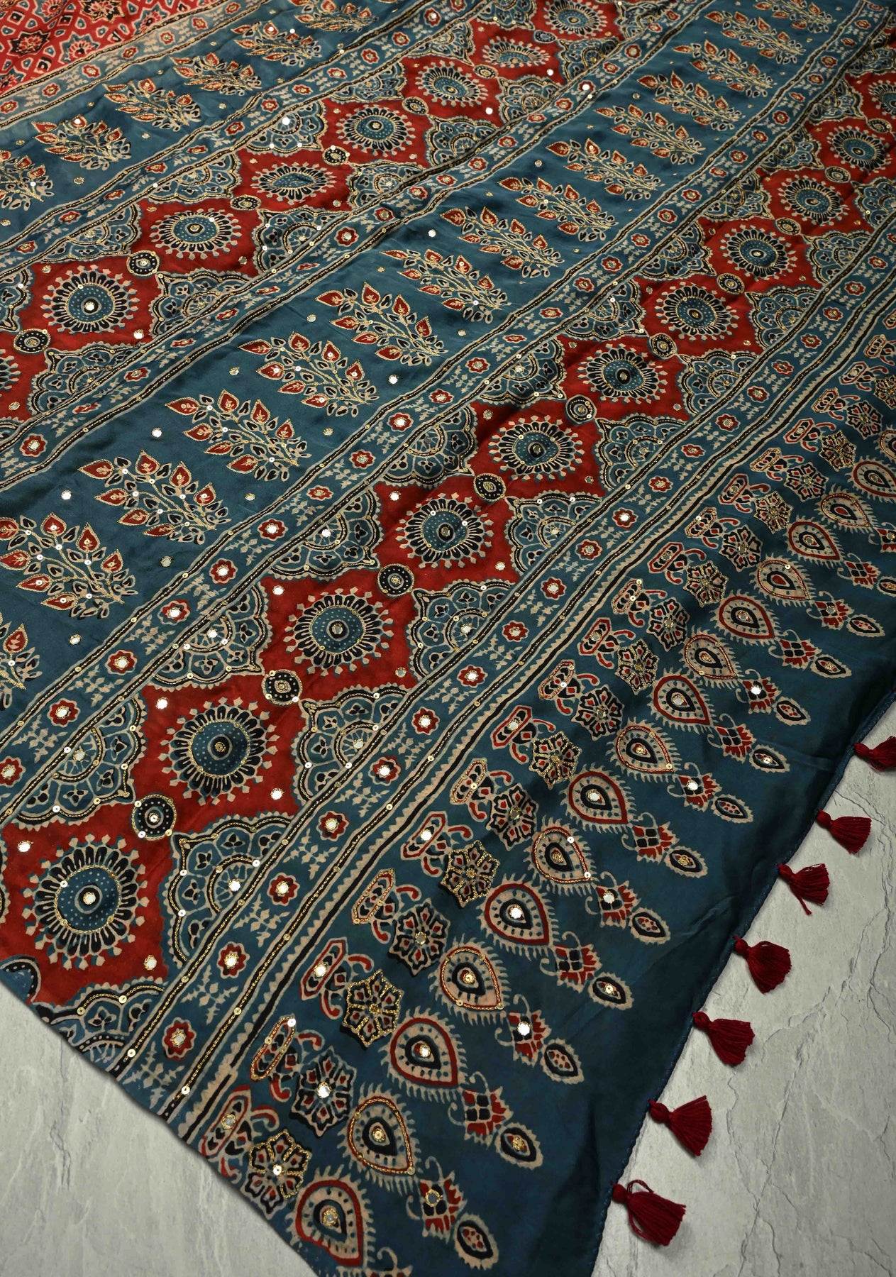 Red Ajrakh Hand Block Print on Modal Silk Saree with Aari-Mirror Work and Blue Pallu