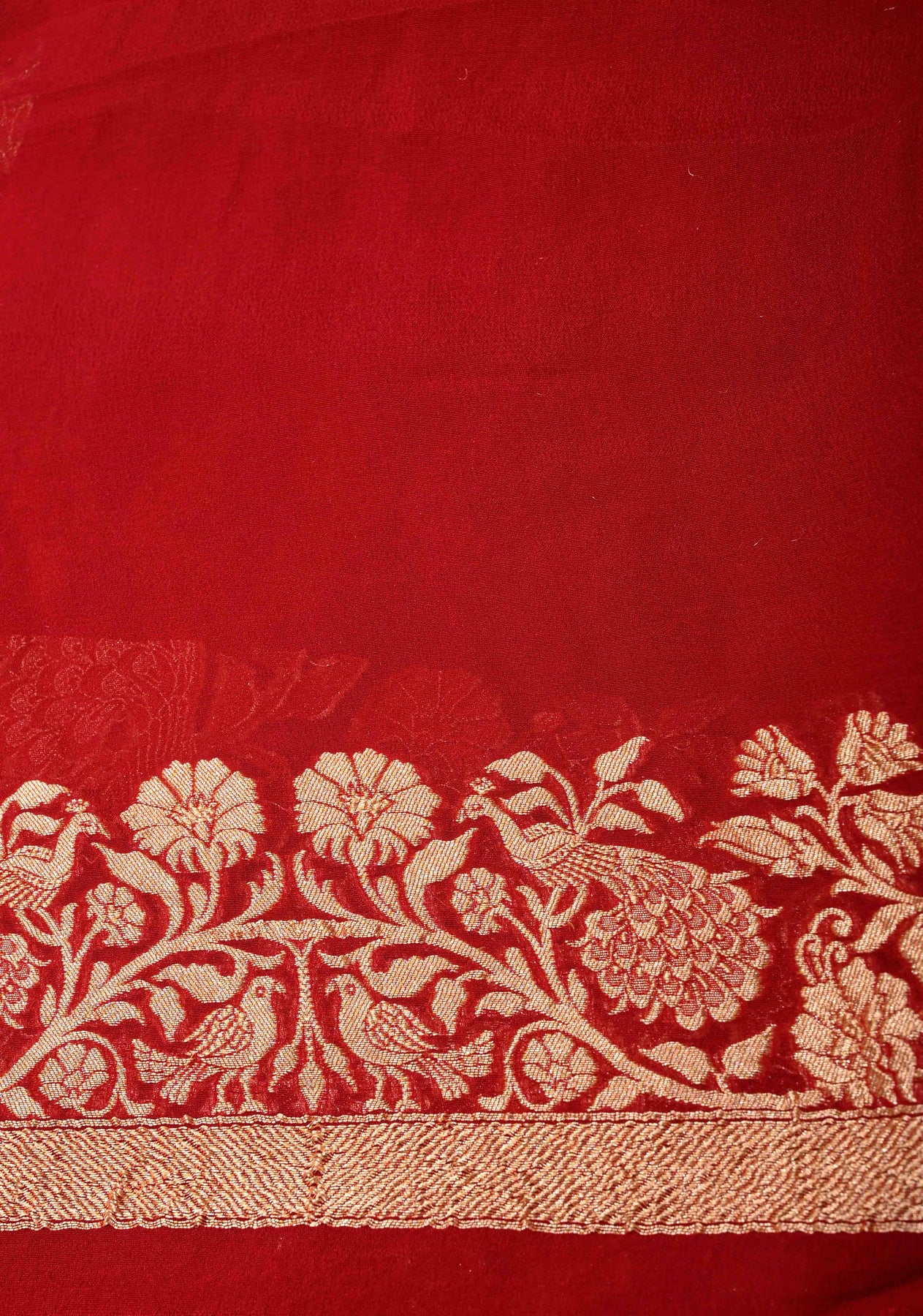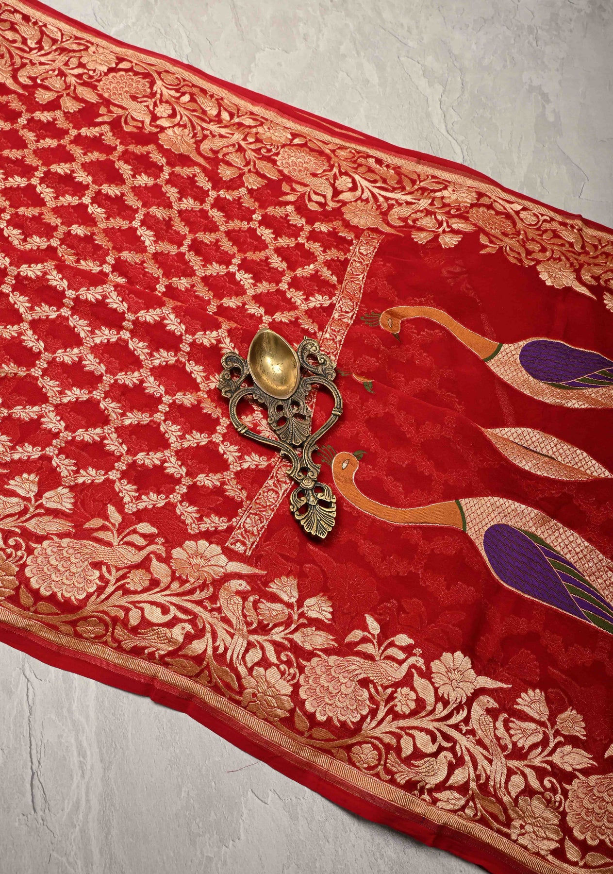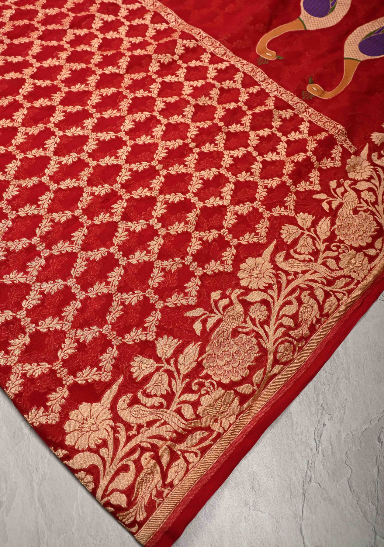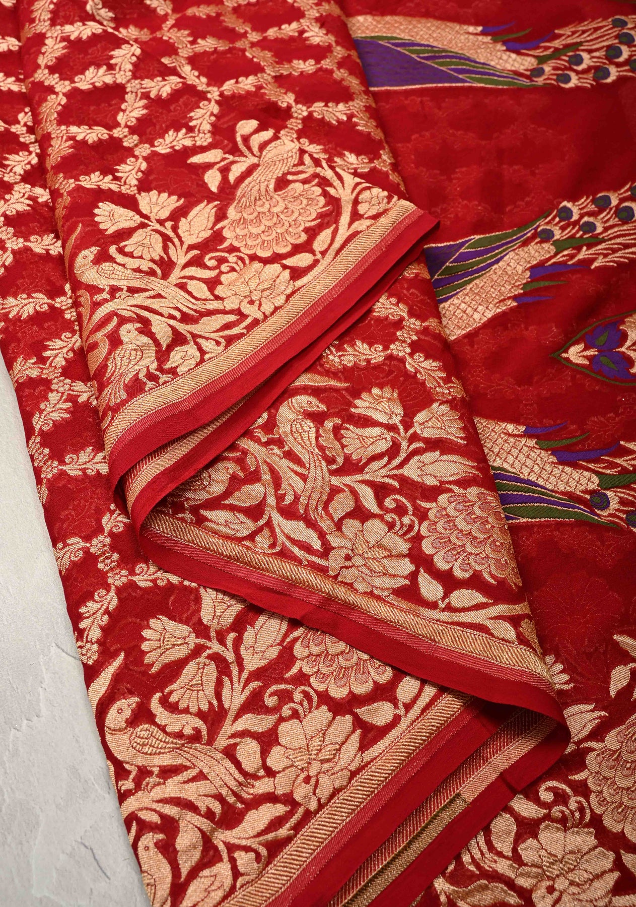 Experience the regal charm of this Red Banarasi Georgette Silk Saree, exquisitely woven with intricate zari jaal work that adds a shimmer throughout the fabric. The lightweight georgette silk offers graceful draping, perfect for celebrations and special occasions. The saree’s highlight is its resplendent peacock meenakari pallu, showcasing vibrant enamel artistry that brings the majestic bird to life with rich colors and fine detailing. Combining traditional Banarasi weaving with exquisite meenakari craftsmanship, this saree is a true masterpiece that exudes elegance and grandeur.