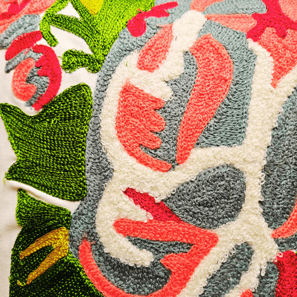 The Revaa design features an abstract floral bloom in shades of coral, sage grey, ivory, and lime green, accented by lush embroidered leaves and textured threadwork. The intricate surface embroidery adds both depth and dimension, making it a standout piece whether placed on your sofa, accent chair, or bed.