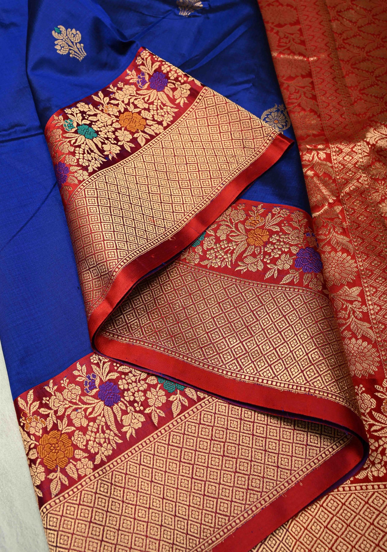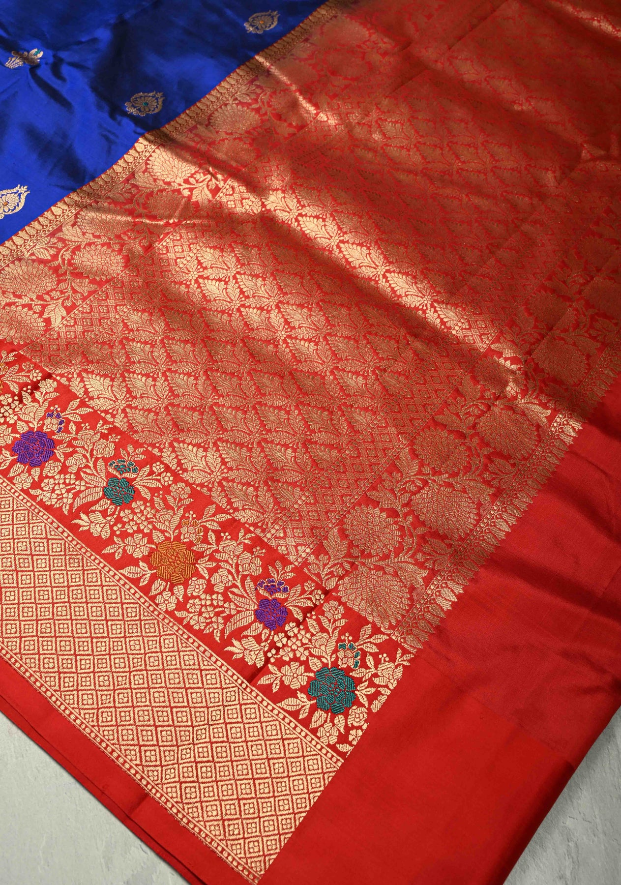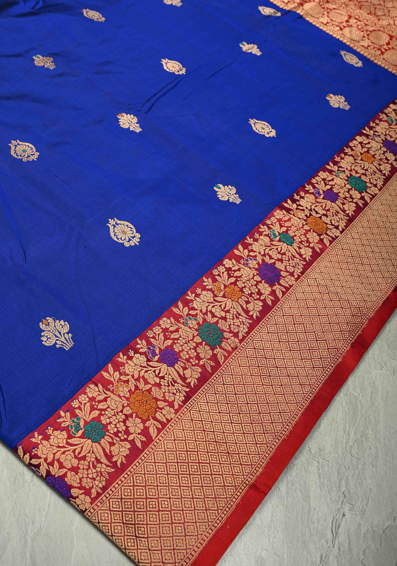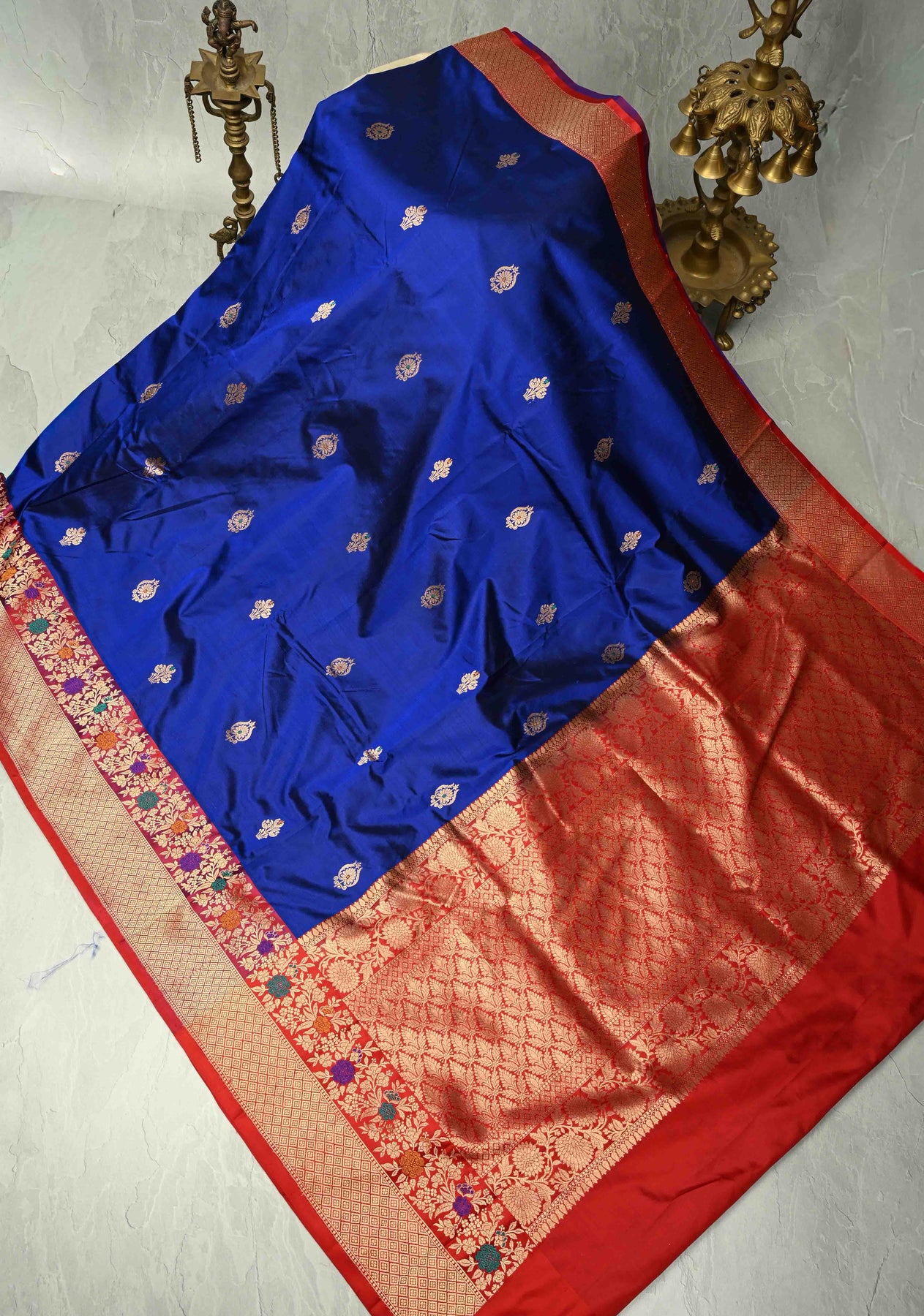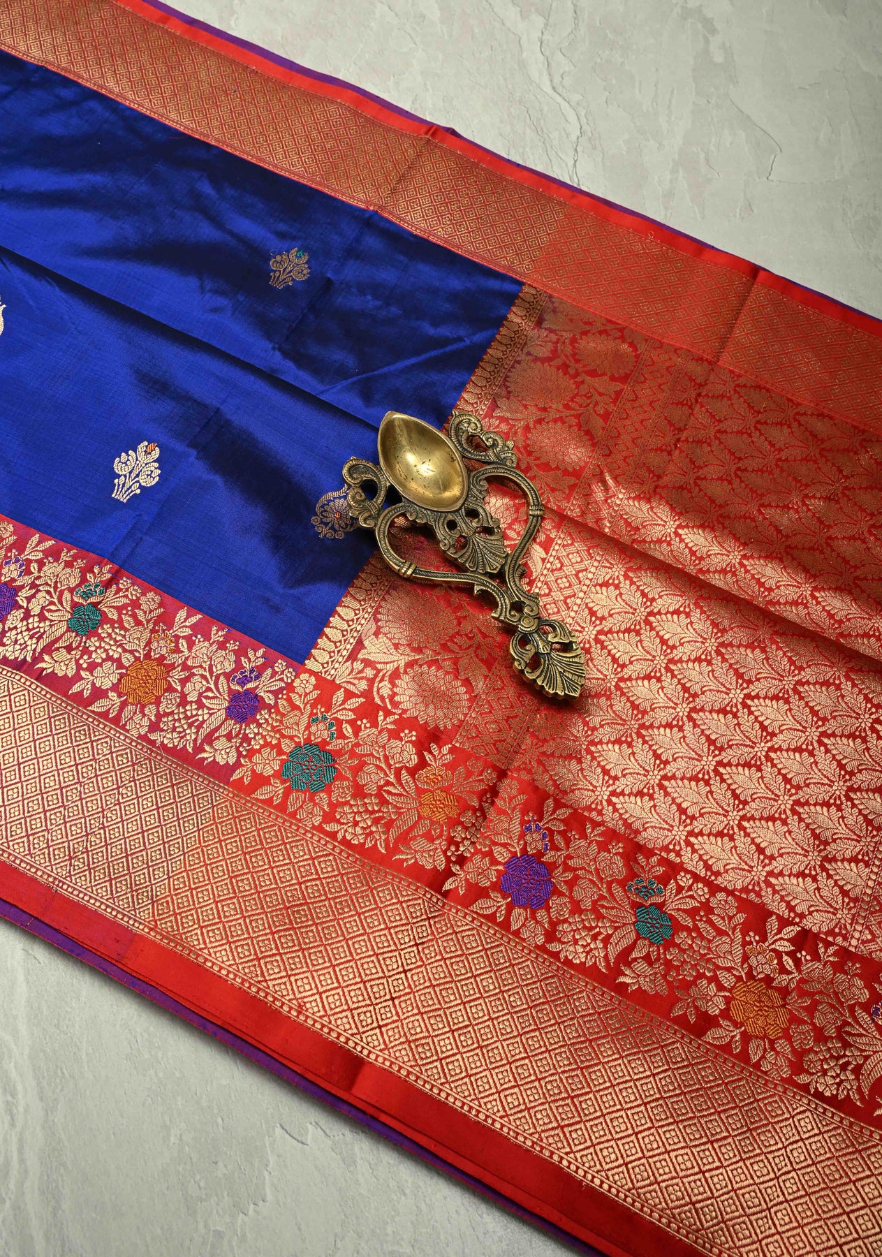 Exude timeless grace in this exquisite Royal Blue Banarasi Katan Silk Saree, woven to perfection with a subtle dual-tone sheen that shifts beautifully under light. The saree features intricate Meenakari buttas spread gracefully across the body, showcasing the rich craftsmanship of Banaras.