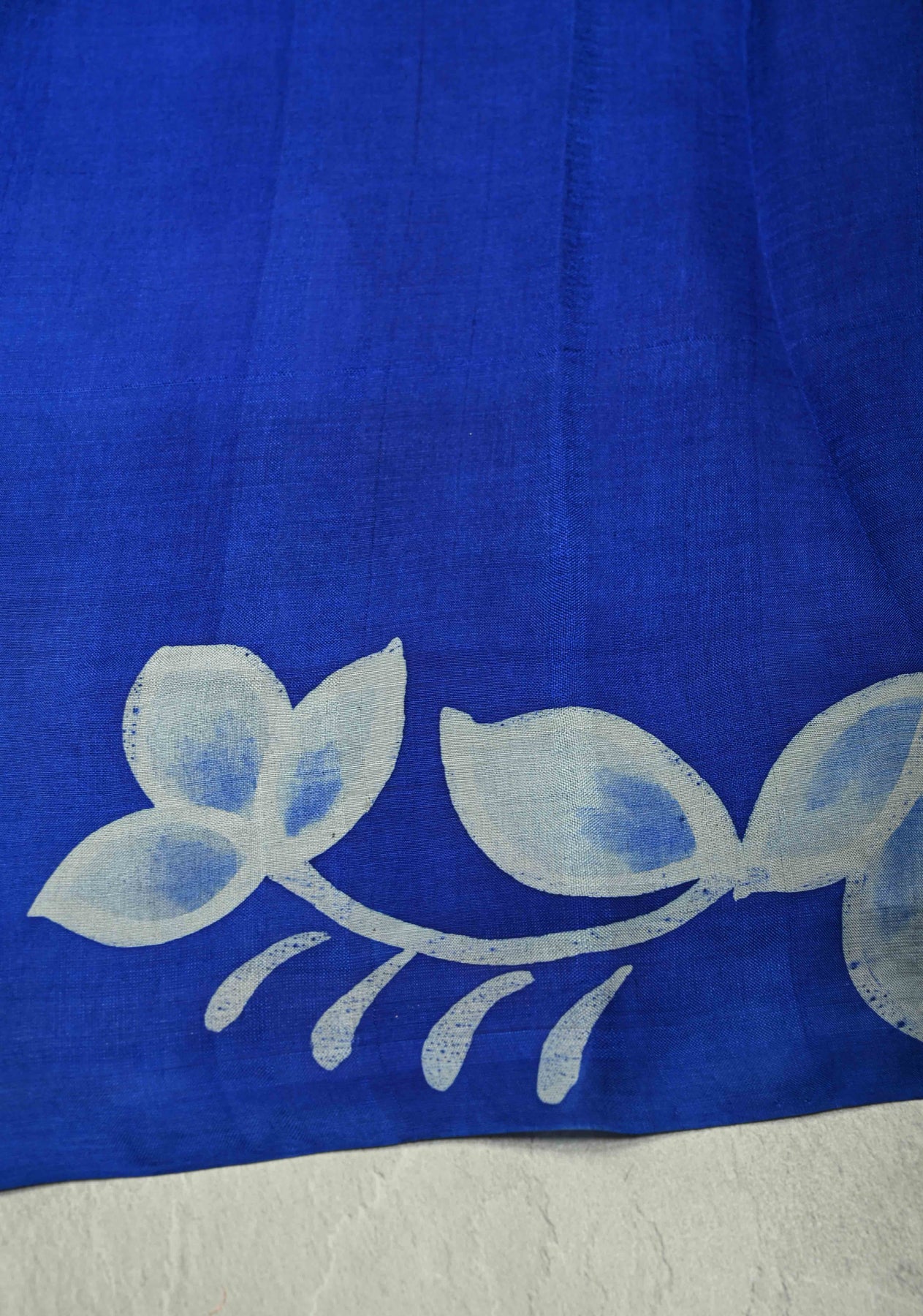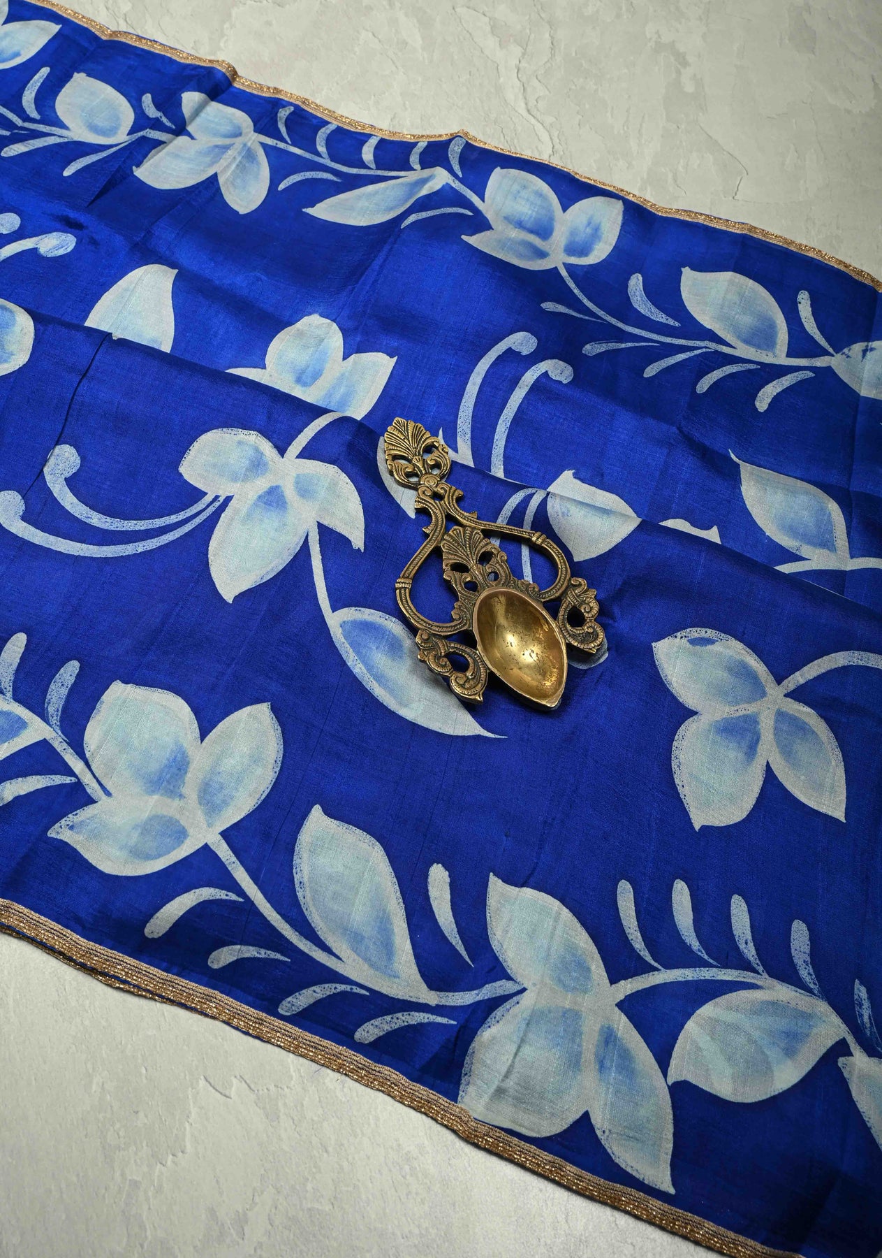 The Sapphire Blue Hand Wax Batik Tussar Silk Saree is a beautiful blend of traditional artistry and contemporary elegance. Crafted from lightweight Tussar silk, it features a vibrant sapphire blue base that enhances its regal charm. The saree is adorned with intricate hand wax batik prints depicting delicate floral motifs, showcasing the skill and finesse of skilled artisans. A subtle lace border adds a touch of sophistication, balancing the vibrant patterns with graceful detailing. Soft, airy, and elegantly draped, this saree is perfect for festive occasions, cultural events, or stylish daytime celebrations.