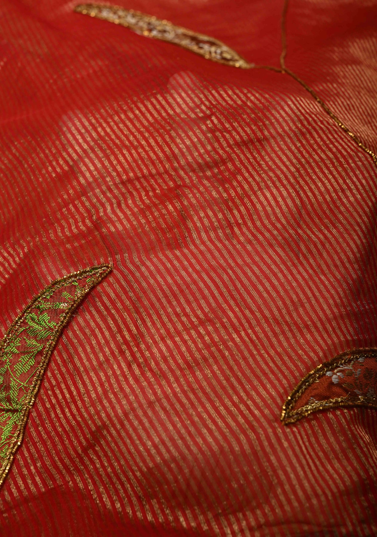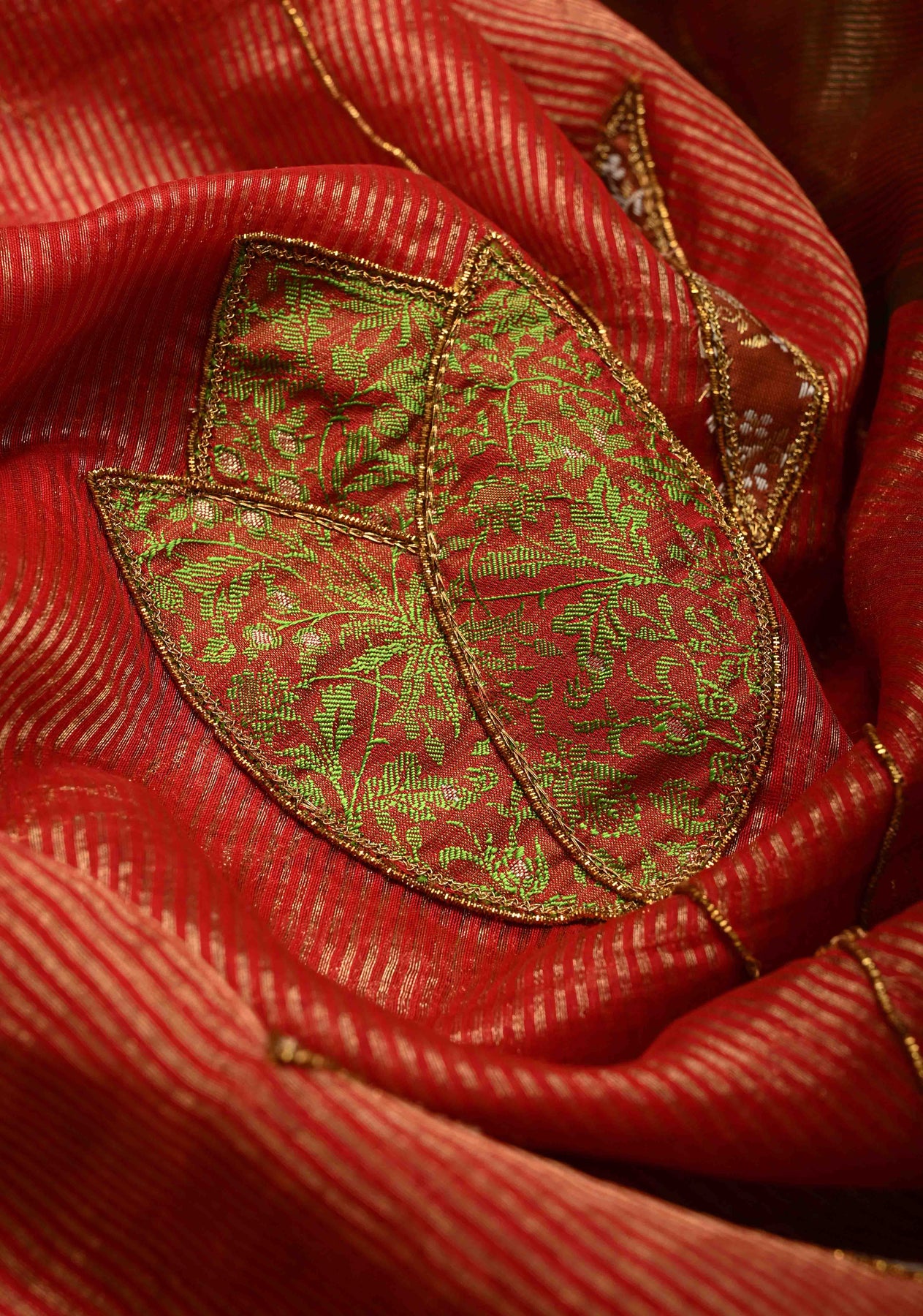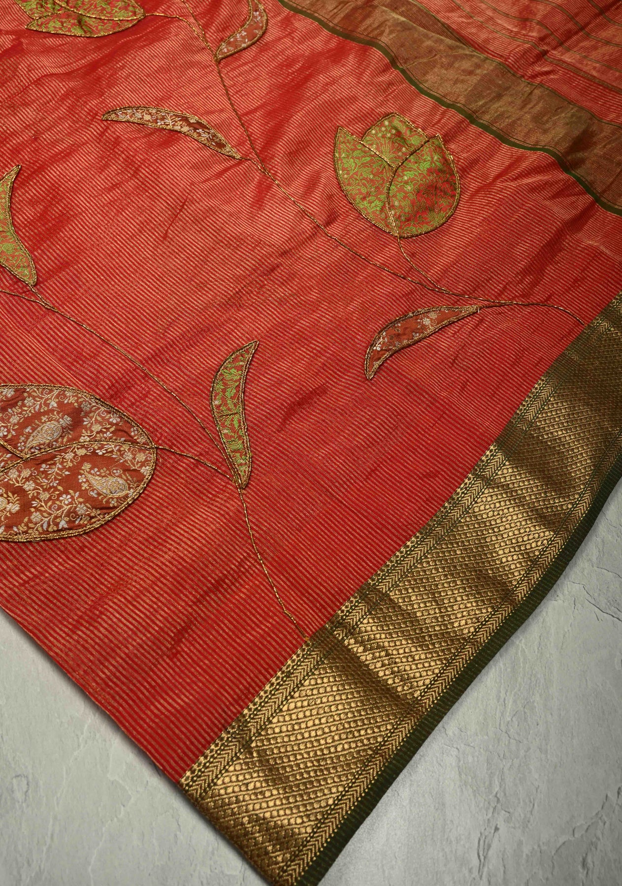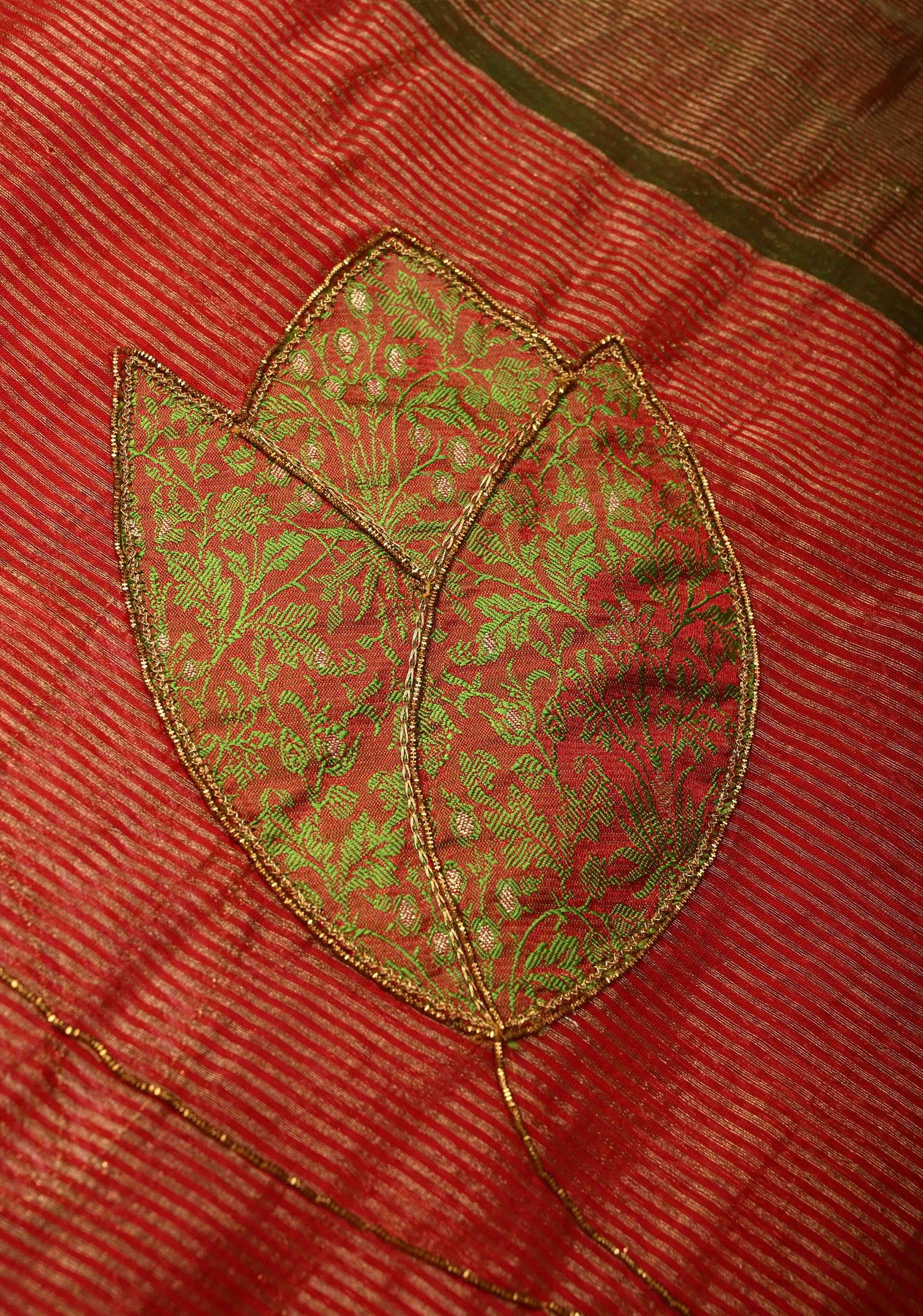 Scarlet Maheshwari Silk Tissue Cotton Saree with Aari Applique Jamawar Brocade Hand Work