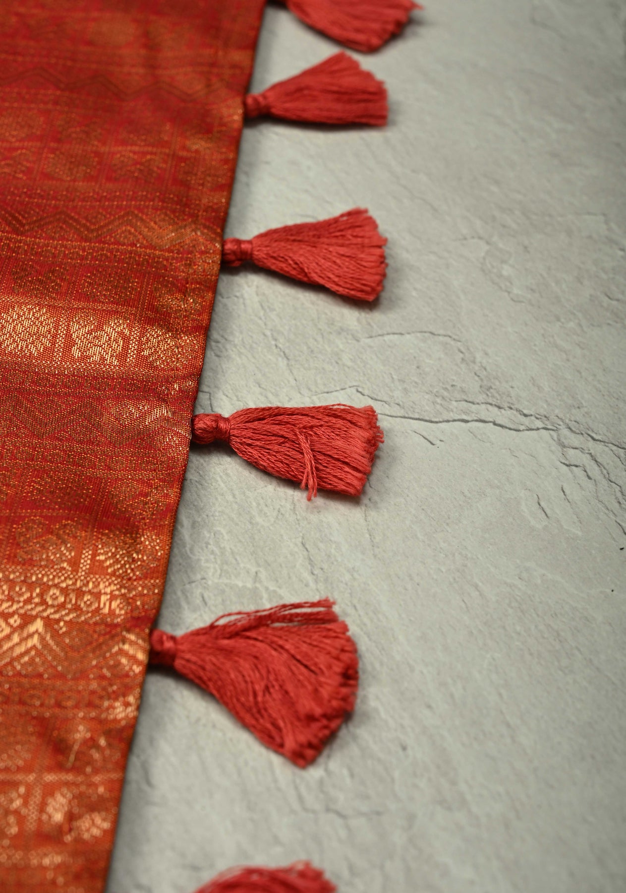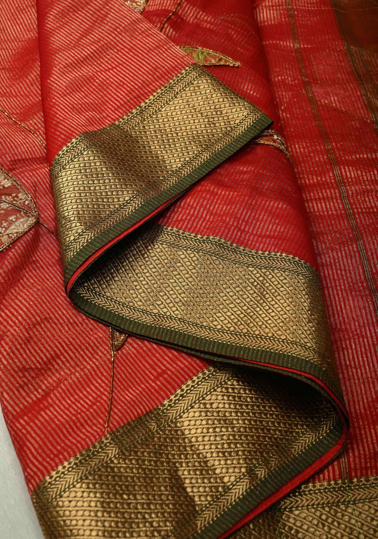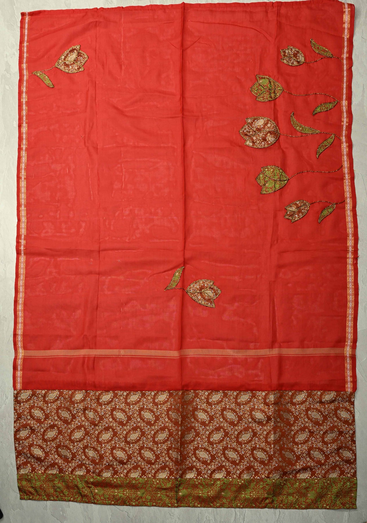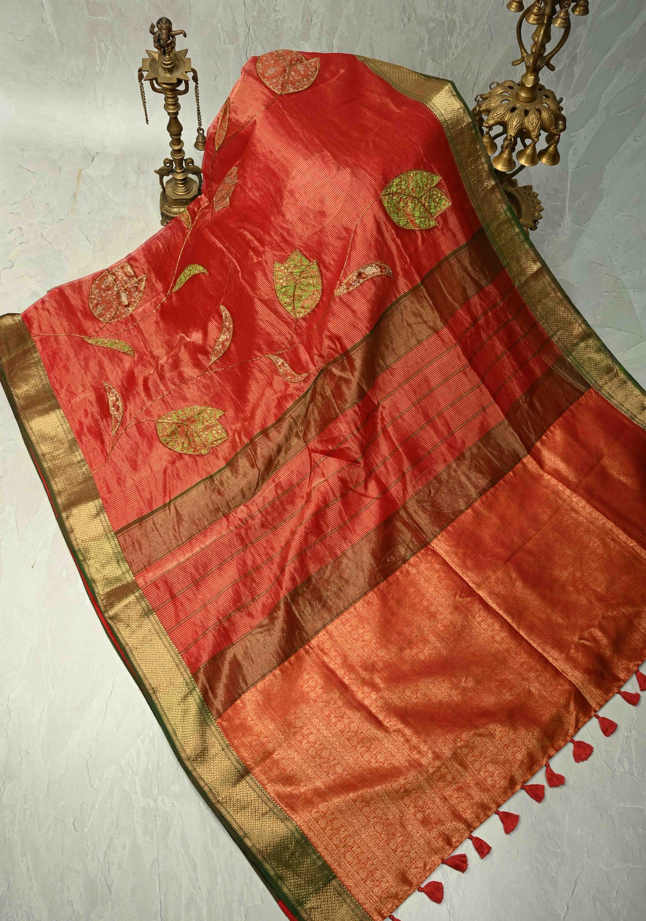 Scarlet Maheshwari Silk Tissue Cotton Saree with Aari Applique Jamawar Brocade Hand Work