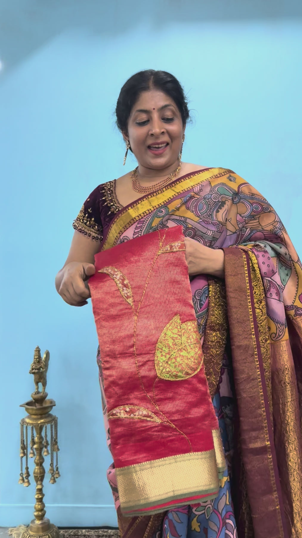 Intricately adorned with Aari applique embroidery and exquisite Jamawar brocade handwork, this saree showcases fine craftsmanship that celebrates India’s textile heritage. The shimmering tissue texture adds a subtle sheen, making it perfect for festive occasions, weddings, or grand celebrations.