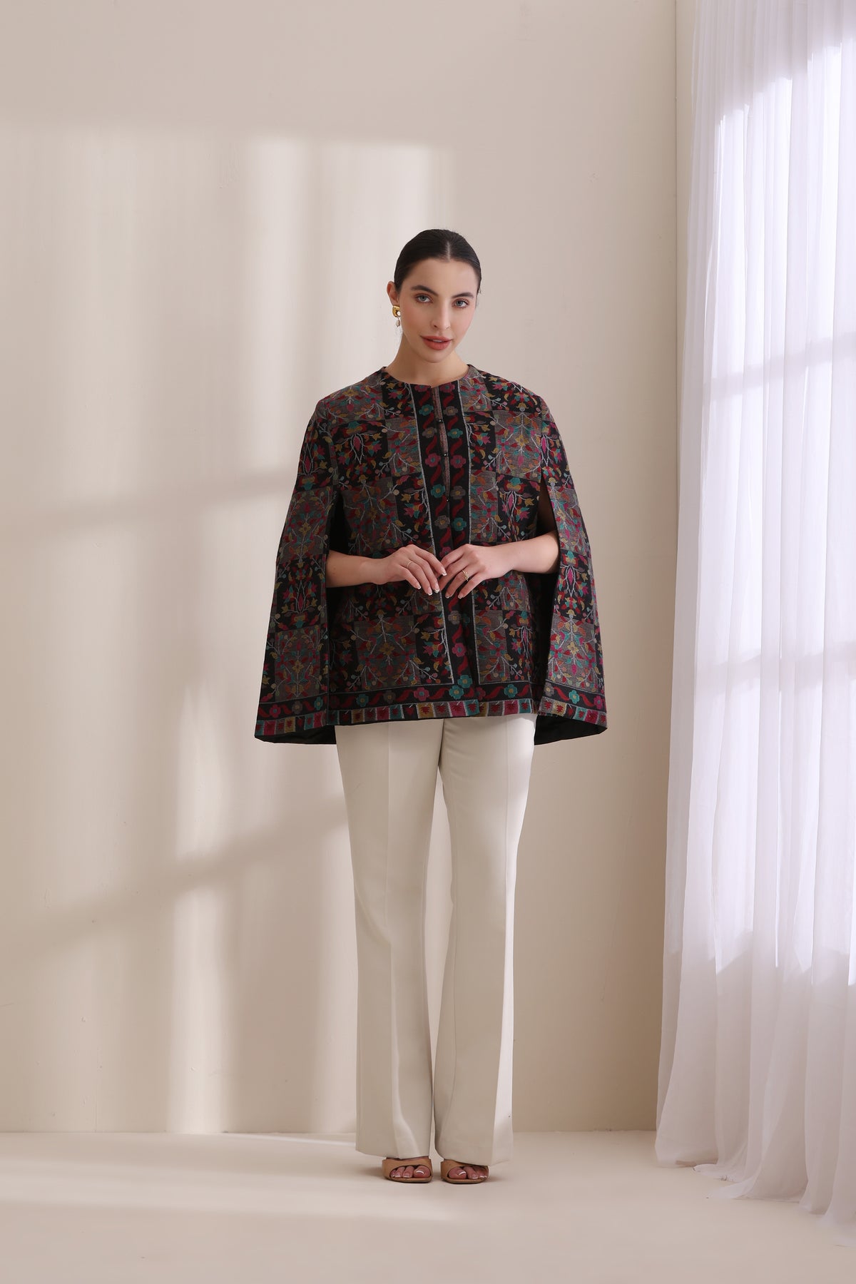 The Raatri woven cape effortlessly blends traditional artistry with modern elegance. Handcrafted with intricate multicolor patterns inspired by Indian textile heritage, this luxurious layer adds sophistication to any wardrobe. Its relaxed silhouette and premium weave ensure comfort and versatility, making it perfect for special evenings and chic daytime styling