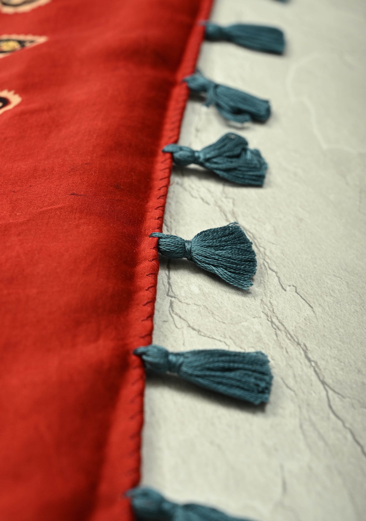 The saree is enhanced with delicate Aari-mirror work, adding subtle sparkle and intricate detailing. A contrasting red pallu completes the look, creating a vibrant and sophisticated finish. Perfect for weddings, festive occasions, parties, and cultural celebrations, this saree is ideal for women who cherish heritage craftsmanship with a contemporary twist.