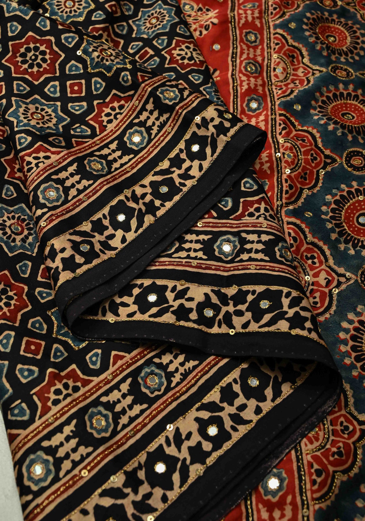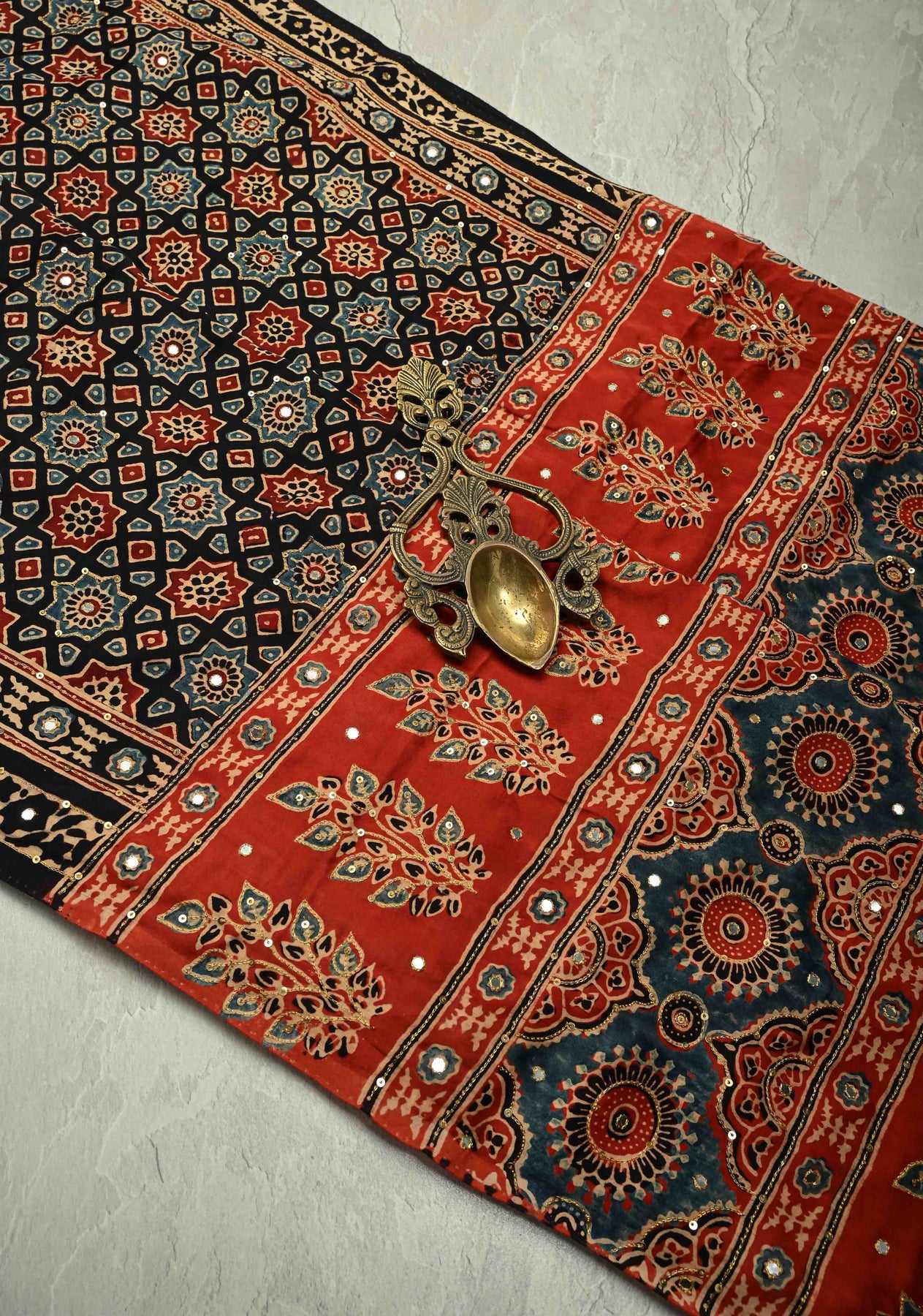 Make a bold and elegant statement with this Stunning Black Ajrakh Hand Block Print Modal Silk Saree, featuring traditional Ajrakh motifs meticulously hand-printed on modal silk for a soft, flowing drape.