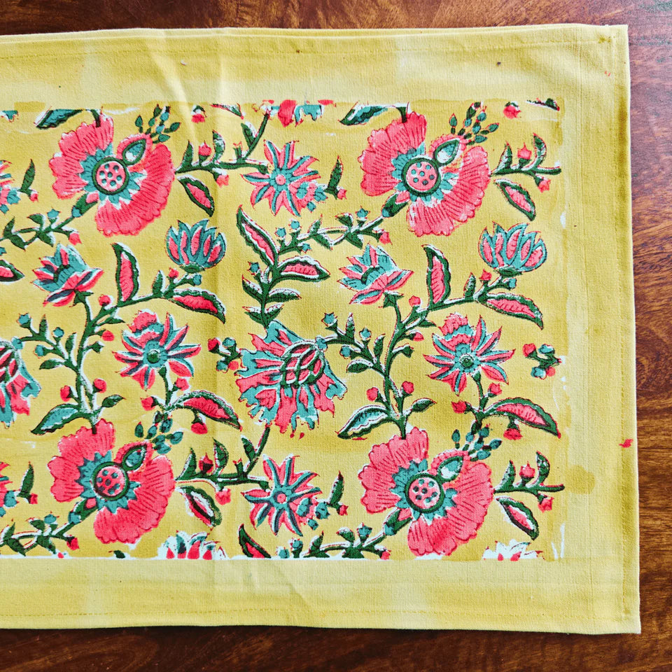 Brighten your table with the radiant charm of the Sunbeam Table Runner by  Crafted from 100% cotton canvas and sized at 13" x 72", this runner features a vibrant all-over floral hand block print in bold reds and teals, set against a warm golden-yellow base. A solid yellow border frames the design, adding a crisp finish that looks stunning on both wooden and neutral-toned tables.