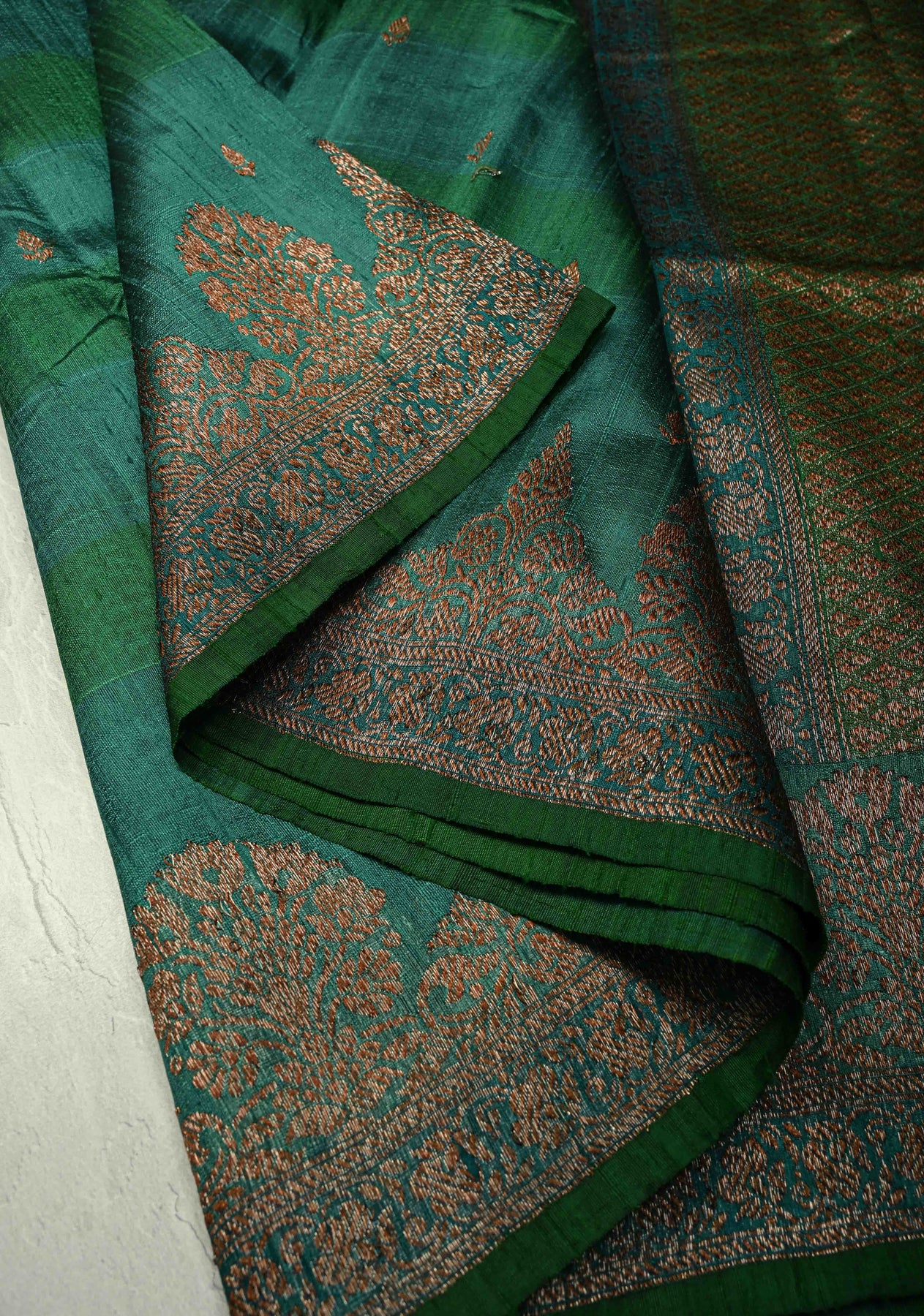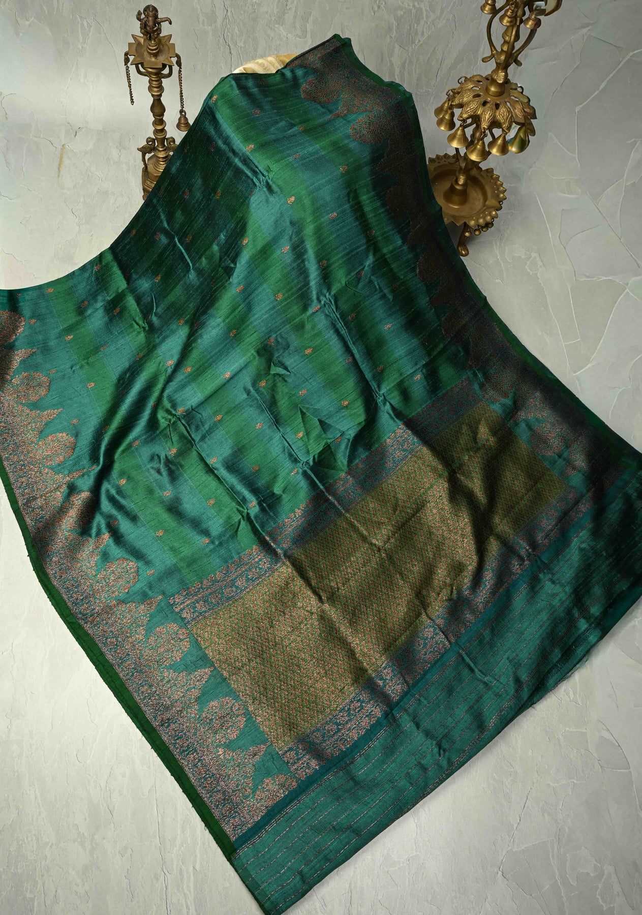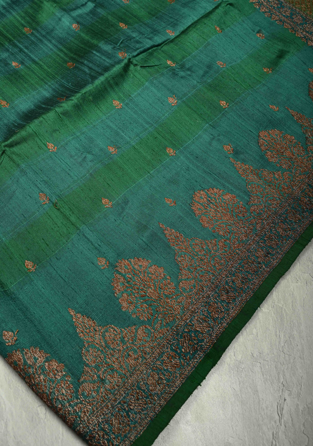 This graceful Banarasi Raw Silk Saree features captivating teal-green horizontal stripes, created through an exquisite hand brush dye technique that adds depth and artistic allure to the fabric. Expertly woven from raw silk, it embodies the richness of Banarasi craftsmanship while maintaining a contemporary, sophisticated appeal. The saree is embellished with intricate antique zari buttis scattered elegantly across the body and finished with a lustrous zari border that enhances its regal charm. Perfect for festive occasions, weddings, and elegant gatherings, this saree exudes timeless beauty and refined style.