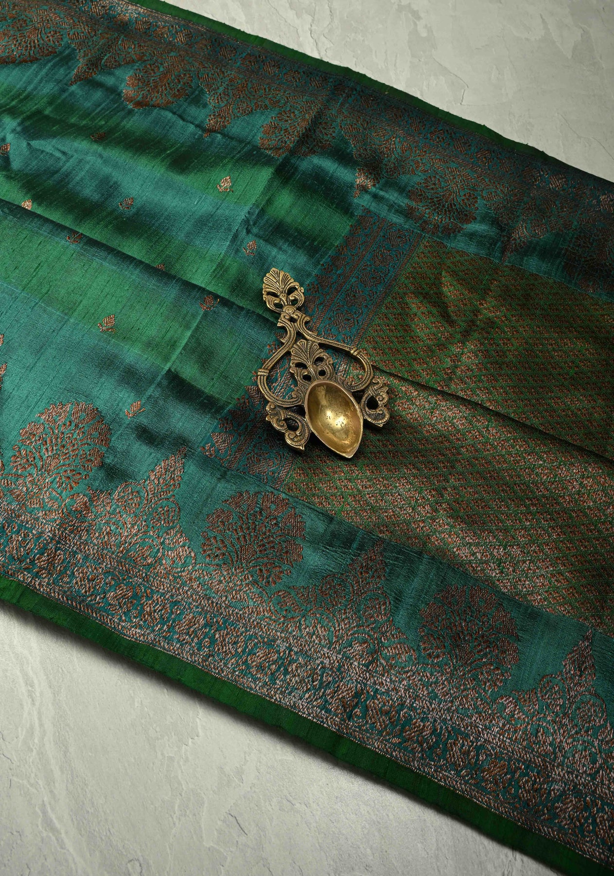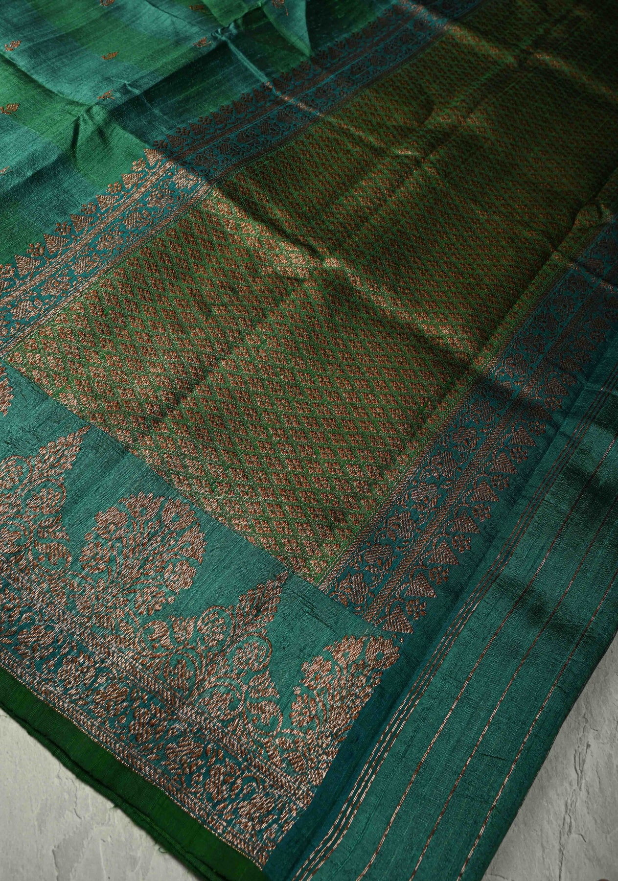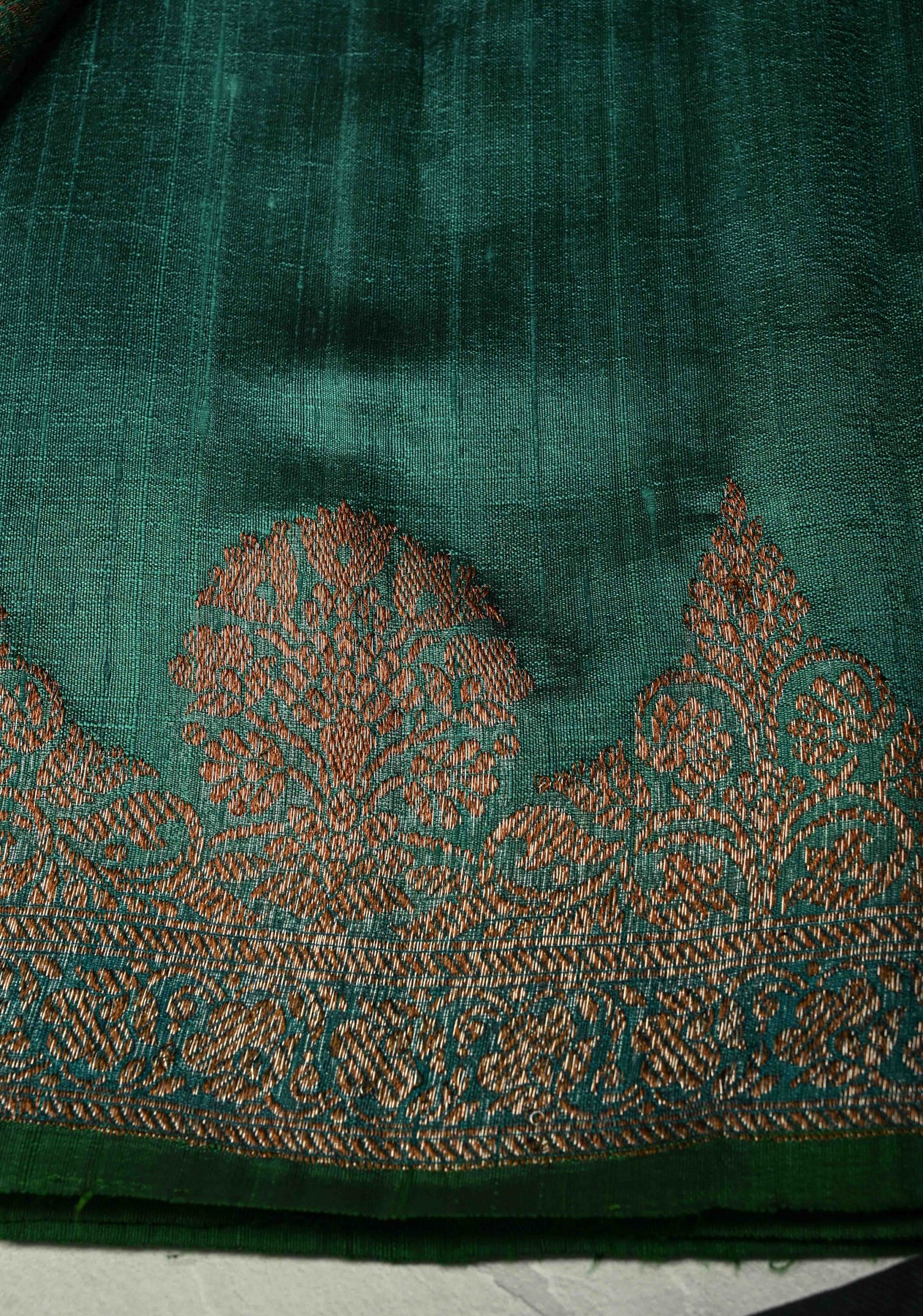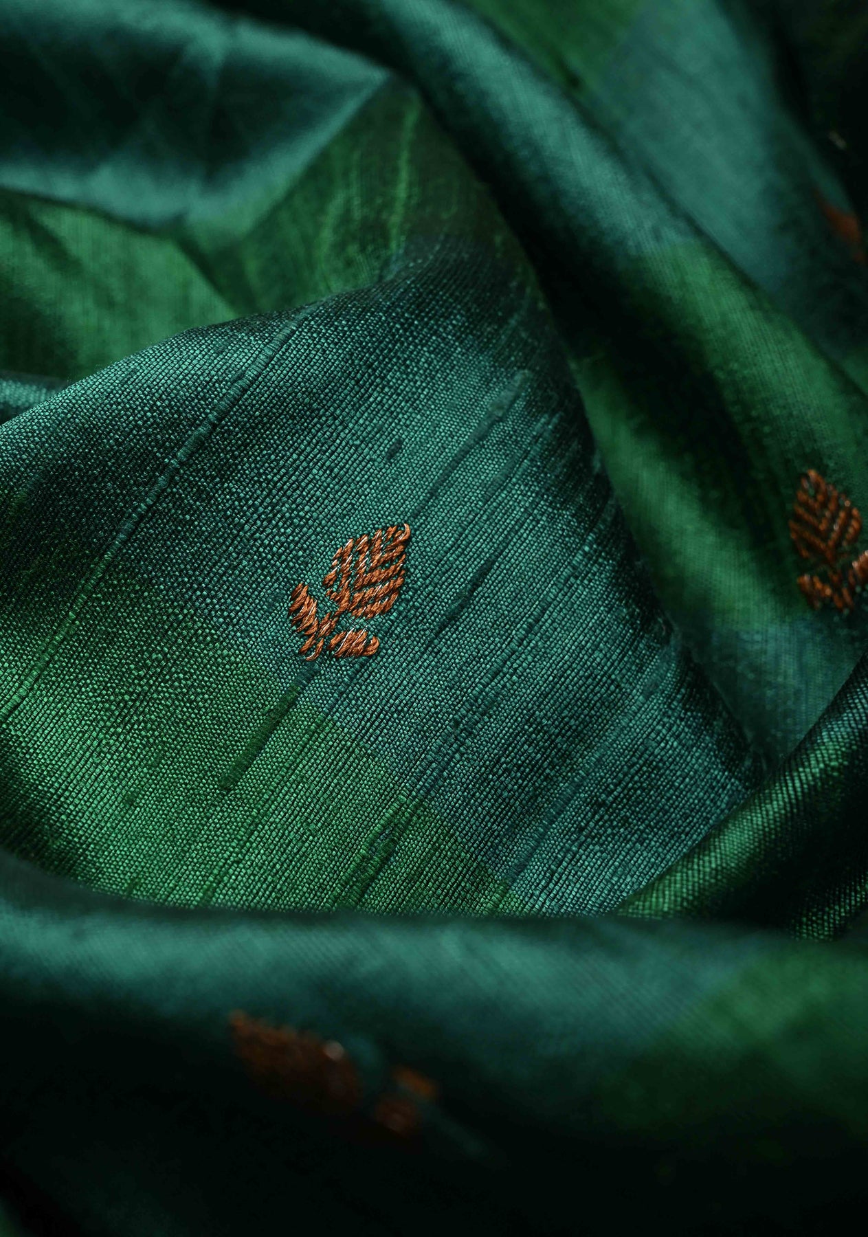 This graceful Banarasi Raw Silk Saree features captivating teal-green horizontal stripes, created through an exquisite hand brush dye technique that adds depth and artistic allure to the fabric. Expertly woven from raw silk, it embodies the richness of Banarasi craftsmanship while maintaining a contemporary, sophisticated appeal. The saree is embellished with intricate antique zari buttis scattered elegantly across the body and finished with a lustrous zari border that enhances its regal charm. Perfect for festive occasions, weddings, and elegant gatherings, this saree exudes timeless beauty and refined style.