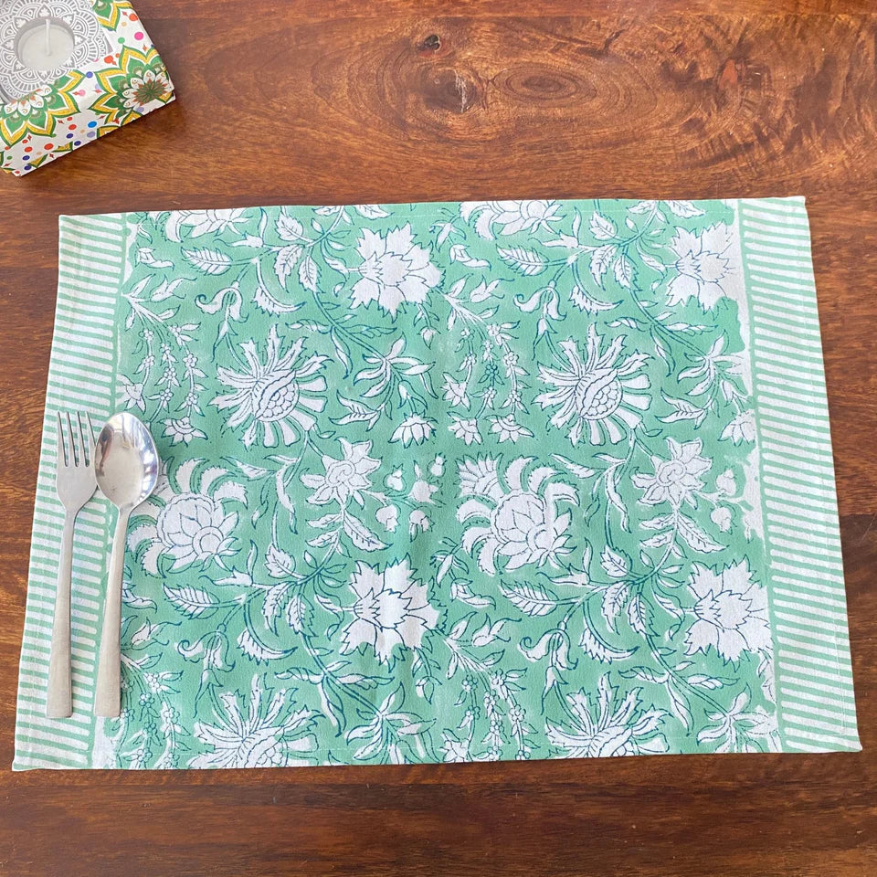 Perfect for creating a fresh and inviting table setting, these placemats effortlessly blend traditional craftsmanship with contemporary style. The refreshing colour combination and timeless botanical pattern make them versatile enough for any occasion, from casual morning brunches to elegant dinner gatherings. Their mint green hue adds a touch of serenity to your dining space while celebrating the beauty of traditional Indian block printing.