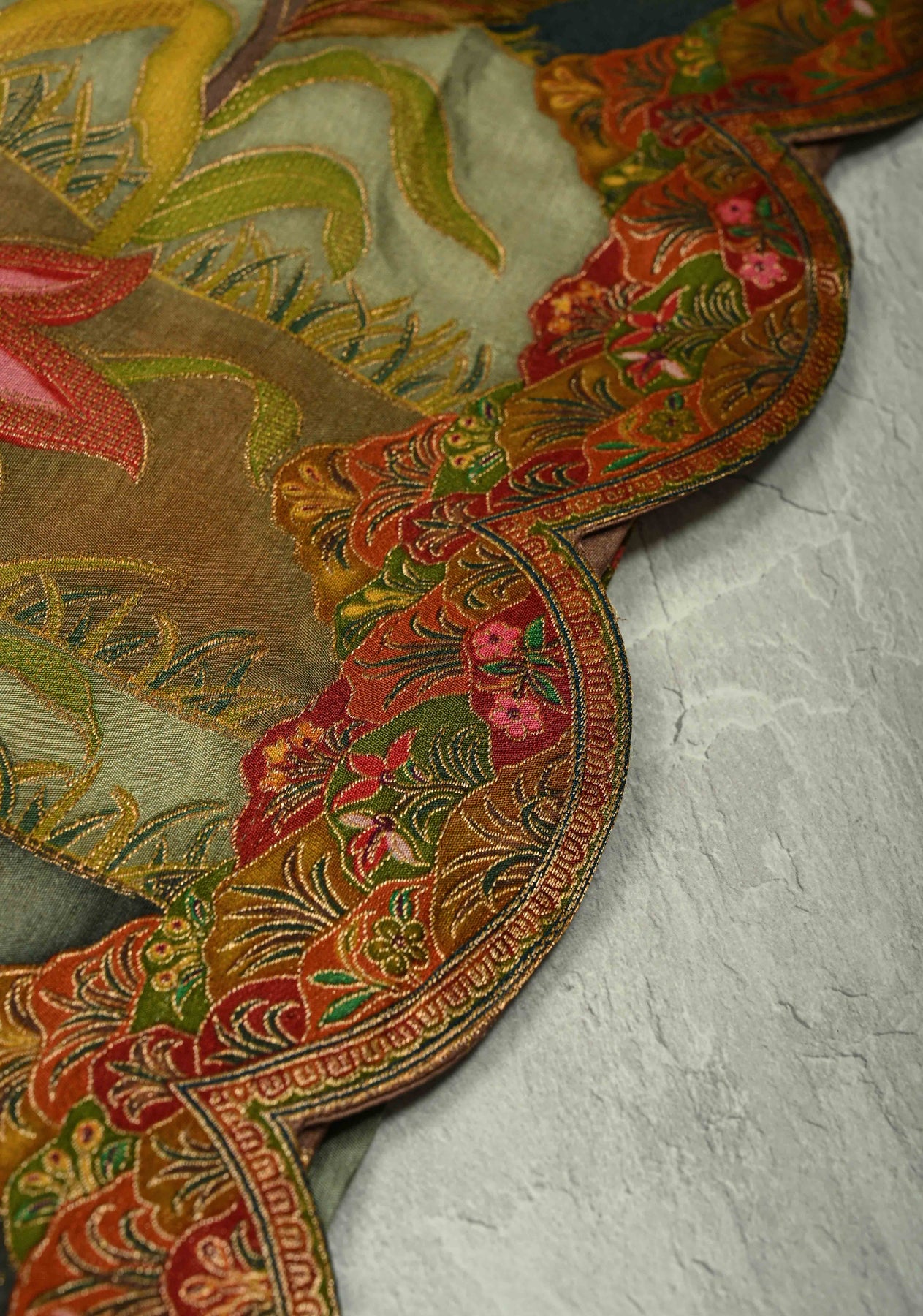 Woven in luxurious vegan soft silk, this saree is a tribute to harmonious ecosystems. Graceful cranes and delicate floral motifs come alive against a soothing dusty rose