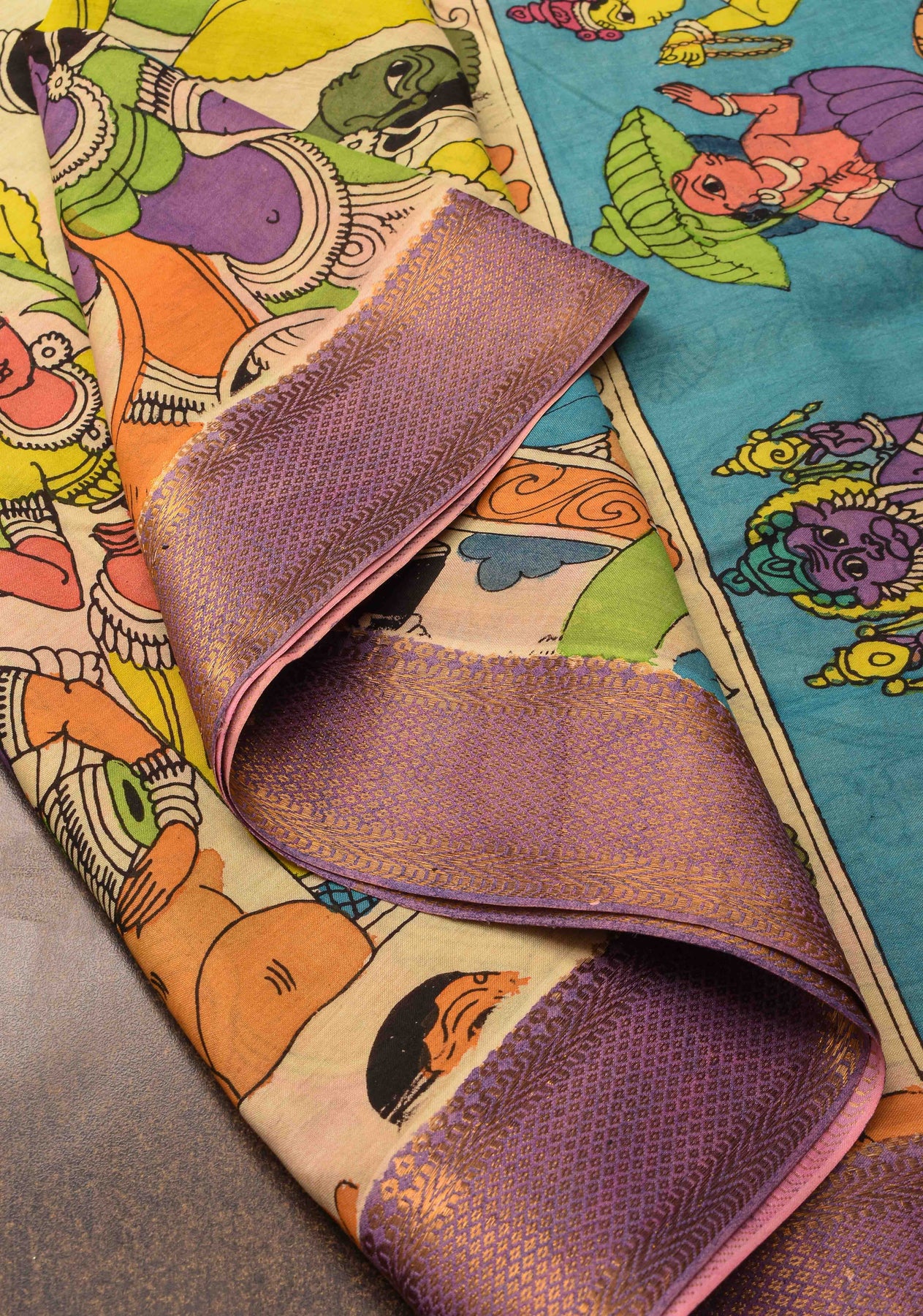 Village Theme : Beige Authentic Pen kalamkari on Mangalagiri Silk Saree with zari border