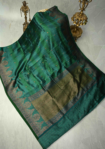 Pure Banarasi Dupion Silk Saree in Forest Green with Antique Zari Paisley Buttas and Zari Border | SILK MARK CERTIFIED
