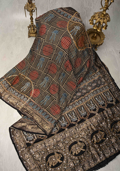 Black Ajrakh Hand Block Print on Dola Silk Saree with Cutdana-Sequins-Mirror Work and Fancy Zari Border