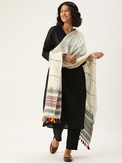 Off White Kanjivaram Soft Silk Saree with Floral Zari Buttas and Meenakari Cross Stitch Temple Border | SILK MARK CERTIFIED