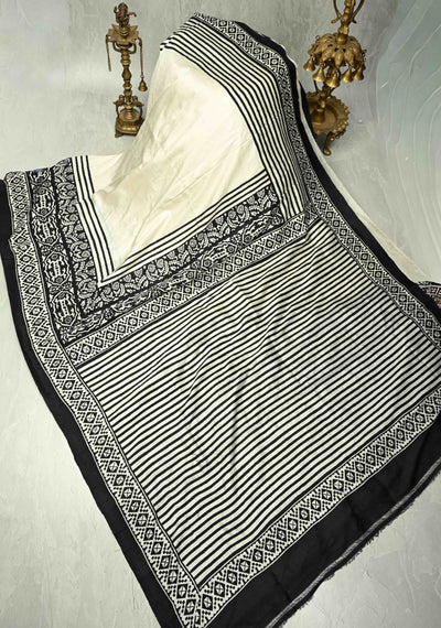 Off White Pure Handloom Silk Saree with Block Print and Contrast Border | SILK MARK CERTIFIED