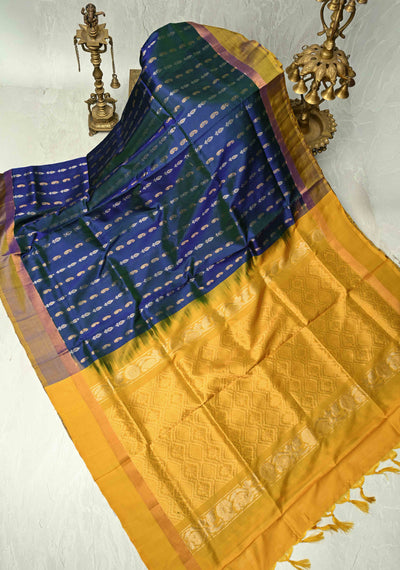Peacock Green Blue Dual Tone Uppada Handloom Silk Saree with Meenakari Buttas and Contrast Border | SILK MARK CERTIFIED