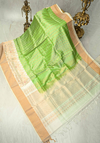Pista Green Uppada Handloom Silk Saree with Zari Buttas and Meenakari Pannel on Tissue Border | SILK MARK CERTIFIED