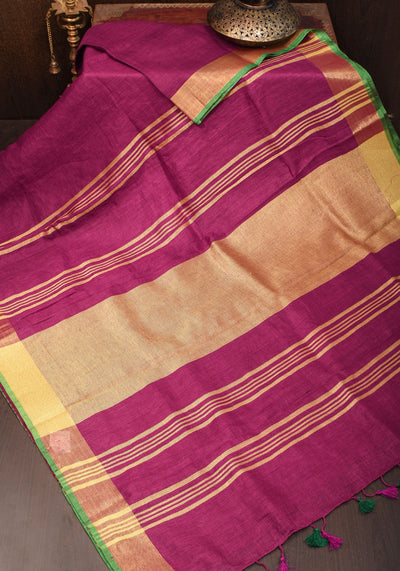 Magenta Pink and Green Linen Saree with Gold Zari Border and Green Selvedge