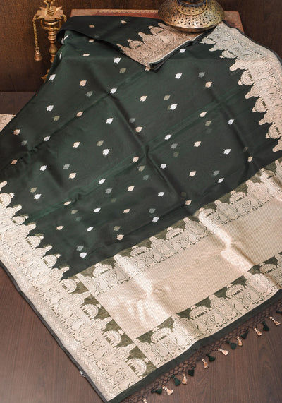 Banarasi Kora Silk Saree in Deep Green with dome shape borders | SILK MARK CERTIFIED