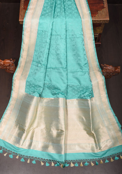 Stunning Tanchoi Floral Banarasi Saree in Pure Silk Satin in Aqua Blue with Zari Border | SILK MARK CERTIFIED
