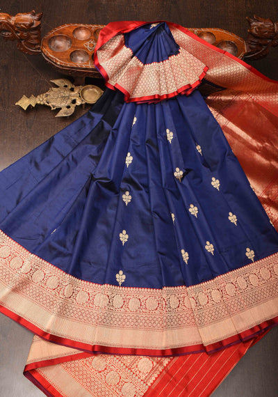 Navy Blue Banarasi Katan silk saree with Zari Buttas, Koniyas and Contrast Zari Border | SILK MARK CERTIFIED