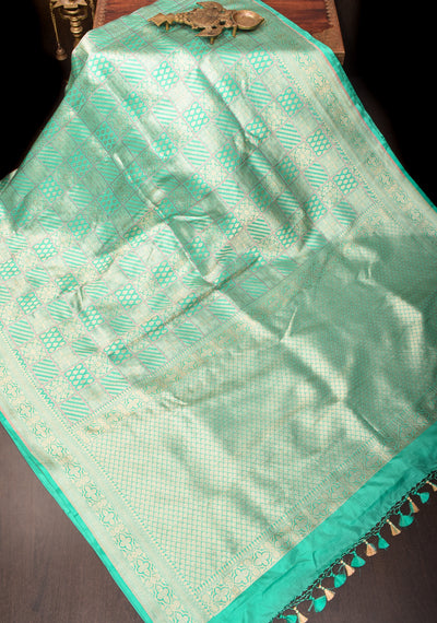 Aqua Green Exquisite Banarasi Katan Silk Saree with checks brocade and Zari Border | SILK MARK CERTIFIED