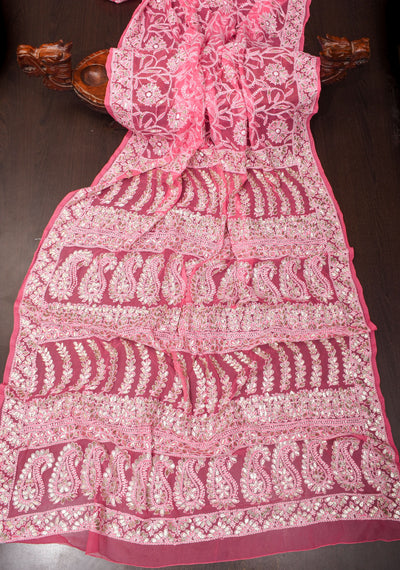 Authentic Hand Chikankari with Gotta embellishments on Shorbet Pink Georgette Saree