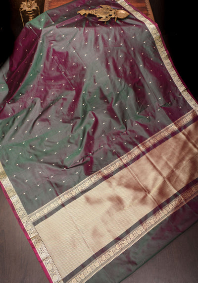 Green and Pink Dual tone Pure Banarasi Katan Silk Saree with Zari stripes and Alfi Motifs | SILK MARK CERTIFIED