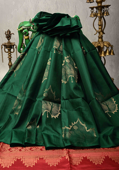 Maple Leaf Buttas Deep Forest Green Borderless Kanjivaram Soft Silk Saree and Contrast Pallu | SILK MARK CERTIFIED