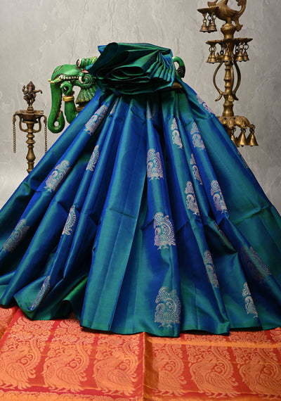 Peacock Blue Dual tone Borderless Kanjivaram Soft Silk Saree with Floral Buttas and Contrast Pallu | SILK MARK CERTIFIED
