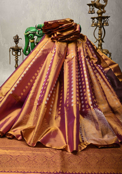 Purple -Gold Tissue Kanjivaram Pure Silk Saree with Gold Silver Zari Buttas and Sun-Mandala Border | SILK MARK CERTIFIED