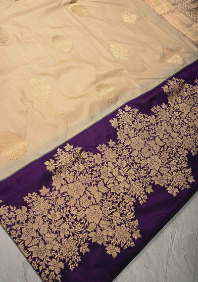 Kadhiyal Weave Beige Pure Banarasi Katan Silk Saree with Floral Zari Buttas and Contrast Zari Border | SILK MARK CERTIFIED