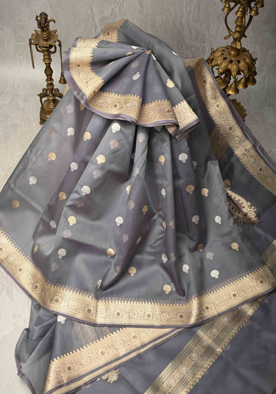 Gray Banarasi Kora Silk Saree with Floral Zari Buttas and Meenakari Zari Border-Pallu | SILK MARK CERTIFIED