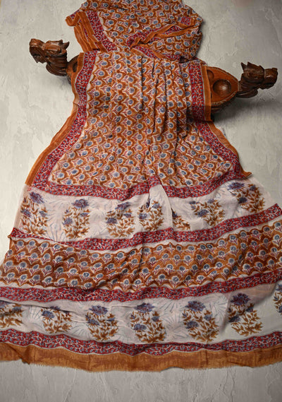 Peanut Brown Georgette Saree with Sanganeri Hand Block Print