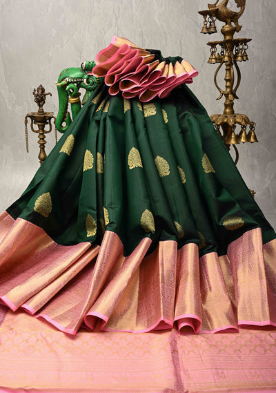 Bottle Green Kanjivaram Pure Silk Saree with Floral Zari Buttas and Contrast Wide Zari Border | SILK MARK CERTIFIED