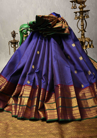 Royal Blue Podi Kattam Zari Checks on Kanjivaram Pure Silk Saree with Zari Buttas and Contrast Wide Zari Border | SILK MARK CERTIFIED