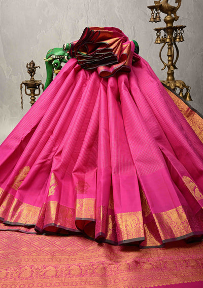 Magenta Podi Kattam Zari Checks on Kanjivaram Pure Silk Saree with Yaali Distinct Motifs on Zari Border | SILK MARK CERTIFIED