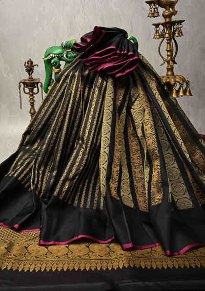 Black Kanjivaram Pure Silk Saree with Zari Vanasingaram Half and Half Vertical Stripes | SILK MARK CERTIFIED