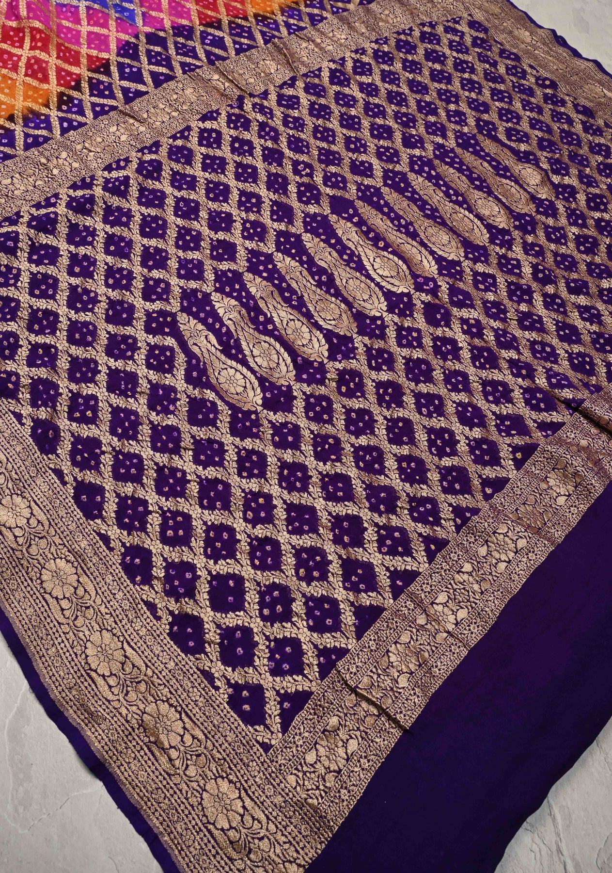 Experience a captivating fusion of traditions with this Authentic Rainbow Hand Bandhej Banarasi Saree. The vibrant rainbow of colors, created using the traditional Bandhej tie-dye technique, provides a stunning backdrop for the intricate Zari Jaal pattern woven throughout the Georgette Silk fabric. A classic zari border adds a final touch of traditional grandeur. This handloom masterpiece is perfect for weddings and festive occasions where you want to exude elegance and cultural richness
