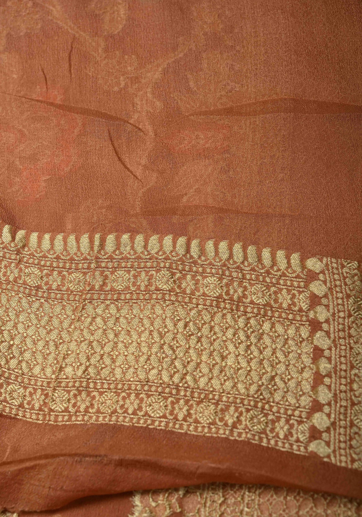The Authentic Sandstone Banarasi Silk Georgette Saree is a perfect blend of earthy elegance and exquisite craftsmanship. Woven from lightweight silk georgette, this saree features a warm sandstone hue that offers a subtle, sophisticated charm. The fabric is adorned with a delicate Meenakari trellis jaal—an intricate lattice pattern enhanced with vibrant enamel work—adding a rich texture and artistic flair. Complementing the design is a classic zari border, shimmering with fine gold threads to elevate the saree’s regal appeal. Ideal for weddings, festive occasions, and formal events, this saree effortlessly marries traditional artistry with contemporary grace.
