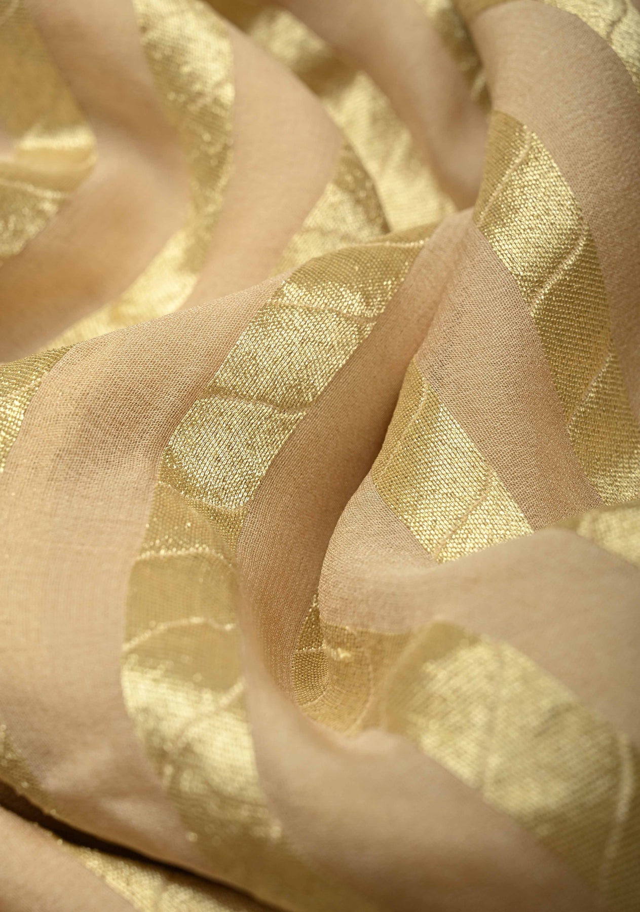 his Off-White Banarasi Georgette Silk Saree is a refined expression of elegance and tradition, featuring graceful vertical stripes set against a subtle turquoise background. Woven from lightweight georgette silk, it drapes effortlessly, offering a fluid and flattering silhouette. The vertical stripes lend a modern, elongated look while beautifully complementing the soft contrast of off-white and turquoise tones. Adding a touch of regal charm, the saree is finished with a shimmering zari border intricately designed with striped detailing, enhancing its overall richness. Ideal for festive occasions, weddings, or formal gatherings, this saree is a perfect blend of understated luxury and timeless Banarasi craftsmanship.