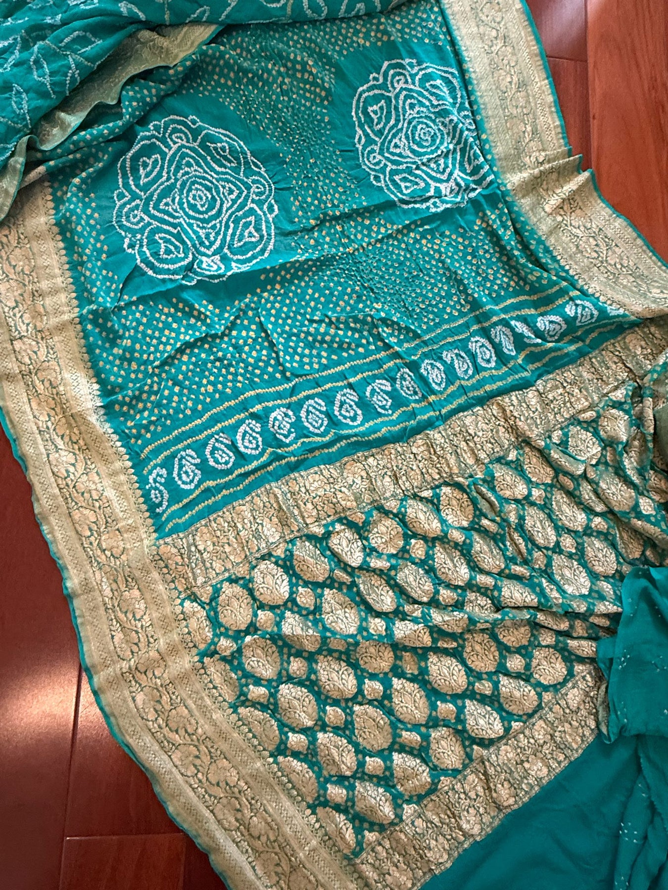 Celebrate timeless elegance with this Teal Blue Sarkam Bandhej Saree, crafted on Pure Banarasi Silk Georgette. This saree brings together traditional artistry and contemporary grace in a harmonious design.