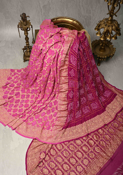 Magenta-Pink Sarkam Bandhej on Pure Banarasi Silk Georgette Saree with Half Gharchola and Half Jaal Design | SILK MARK CERTIFIED