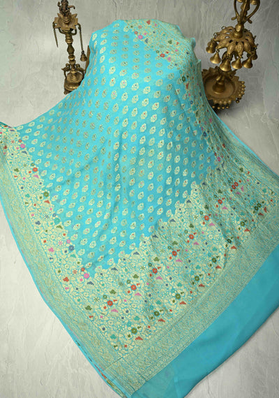 Authentic Turquoise Meenakari Work on Banarasi Silk Georgette Saree with Floral Buttas and 2 Side Equal Ornate Skirt Border | SILK MARK CERTIFIED